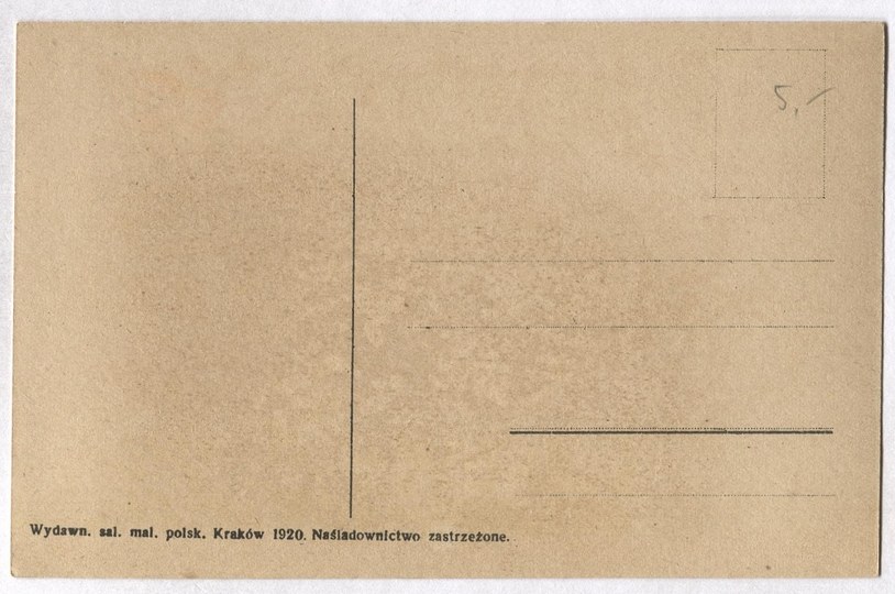 Wydawn. sal. mal. polsk. Kraków 1920. Kompozycja Kajetana Saryusza-Wolskiego (bez sygnatury). Pod kompozycją nadruk "Litogr. K. Kranikowski, Kraków". Bez korespondencji i znaczka. Niewielkie przebarwienia na odwrocie.