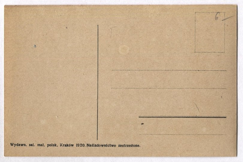 Wydawn. sal. mal. polsk. Kraków 1920. Kompozycja Kajetana Saryusza-Wolskiego (bez sygnatury). Pod kompozycją nadruk "Litogr. K. Kranikowski, Kraków". Bez korespondencji i znaczka. Stan dobry.