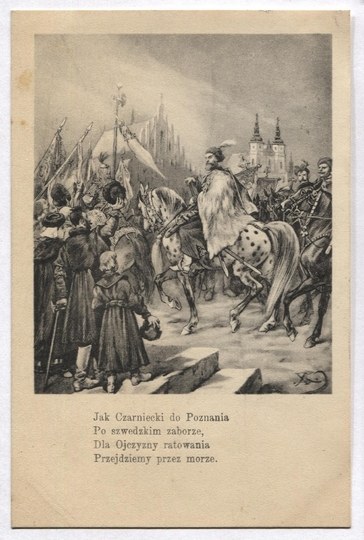 Bez danych wydawniczych. Czarno-biała reprodukcja obrazu Juliusza Kossaka. Pocztówka z długą linią adresową. Z korespondencją i znaczkiem. Data stempla nieczytelna (ca 1901). Nieznaczne zaplamienia.