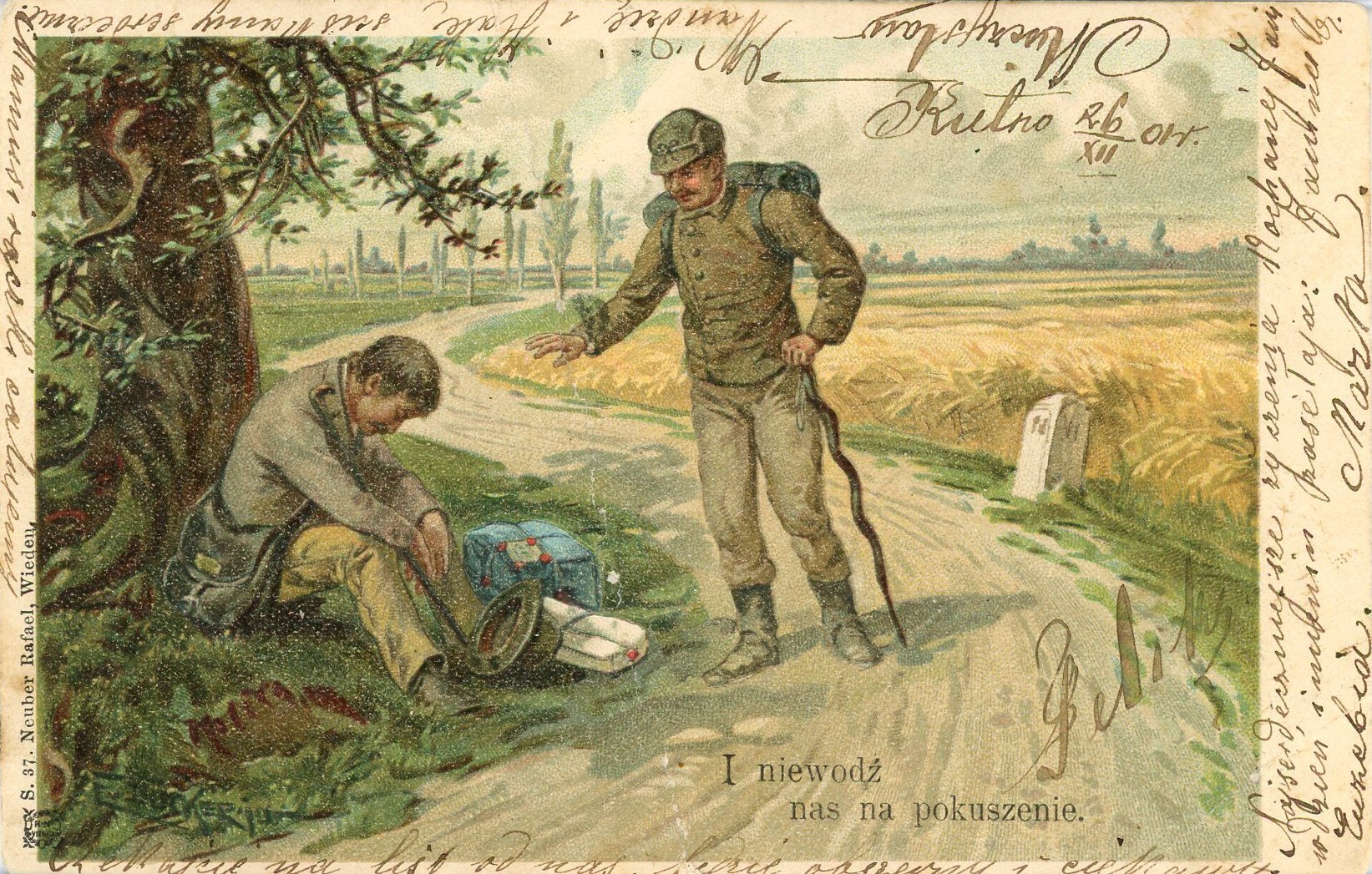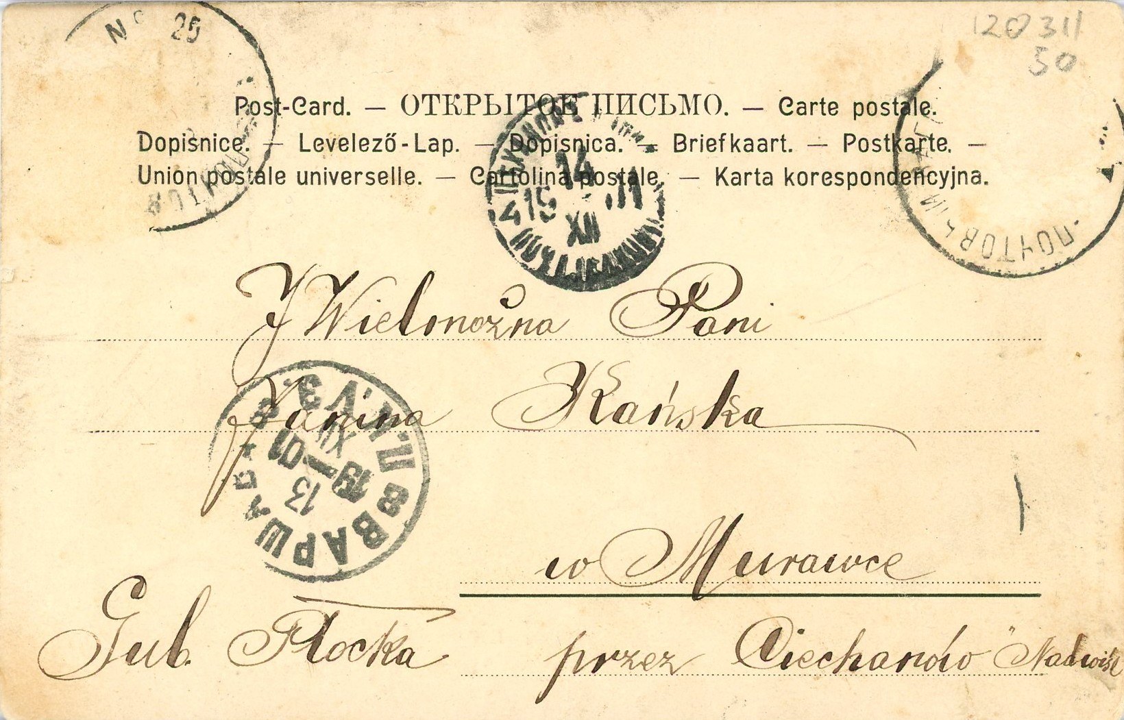 B. w. m. i r. Kartka zapisana, dat. 26.12.1901 r. Pionowe złamanie, brak znaczka.