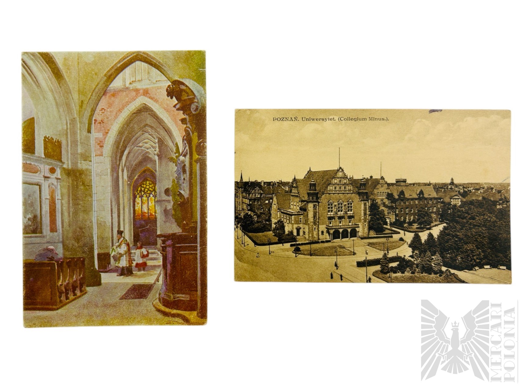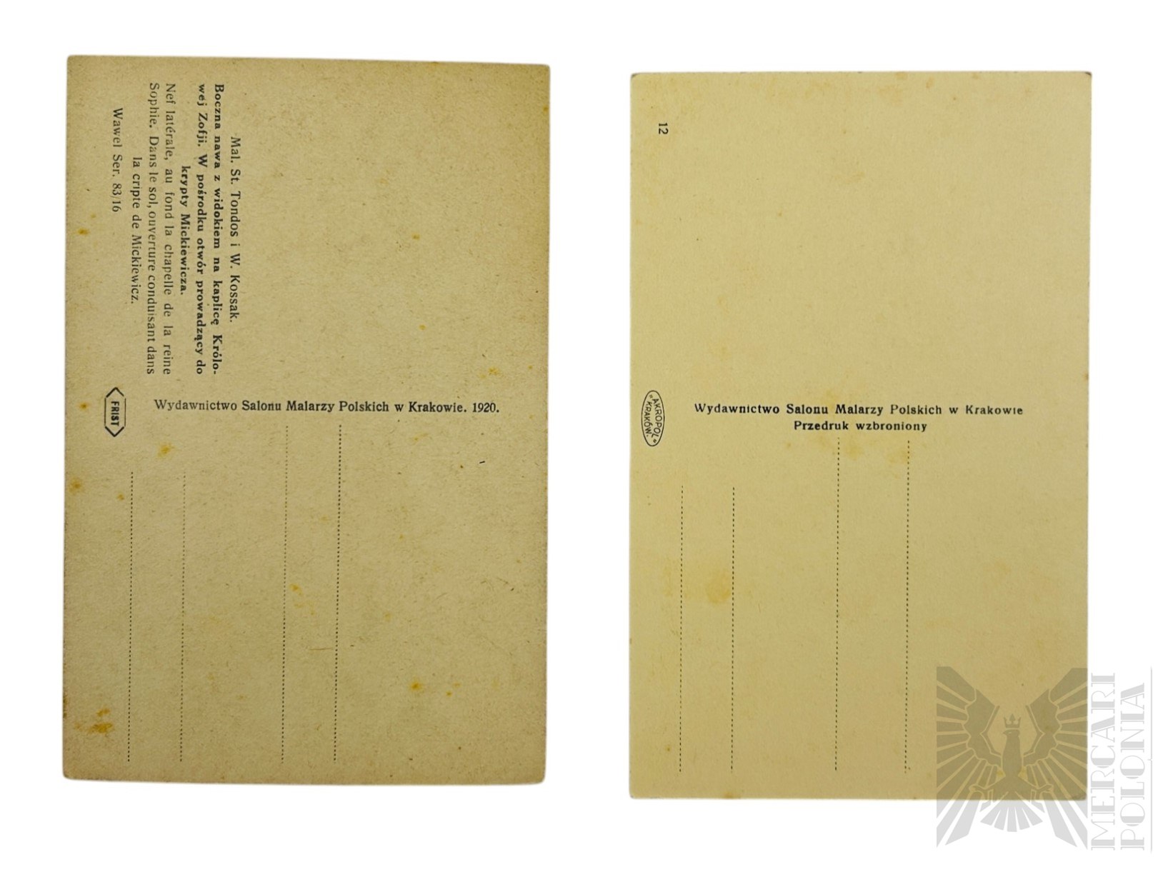 II RP, 1920 r., Kraków - Dwie Pocztówki Wydawnictwo Salon Malarzy Polskich: Poznań, Collegium Minus; Kaplica Królowej Zofii na Wawelu (Według W. Kossaka i S. Tondosa)