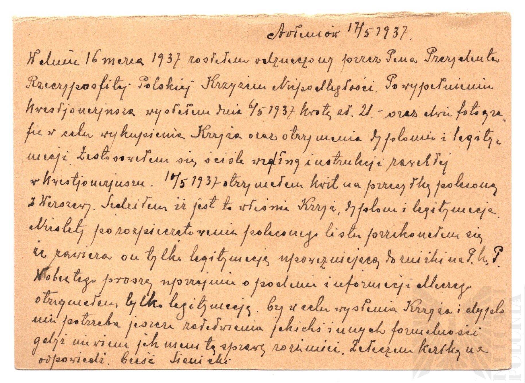 Kartka pocztowa wysłana przez Jana Siwickiego mieszkającego w Baranowie do Komitetu Krzyża i Medalu Niepodległości w Warszawie16 marca 1937 roku. Jak wynika z treści kartki w marcu 1937 roku został odznaczony Krzyżem Niepodległości. Po przesłaniu wymaganych dokumentów i fotografii otrzymał przesyłkę, która zawierała jedynie legitymację, a nie sam Krzyż i dyplom. prosił o informację, kiedy mogą zostać one dostarczone.