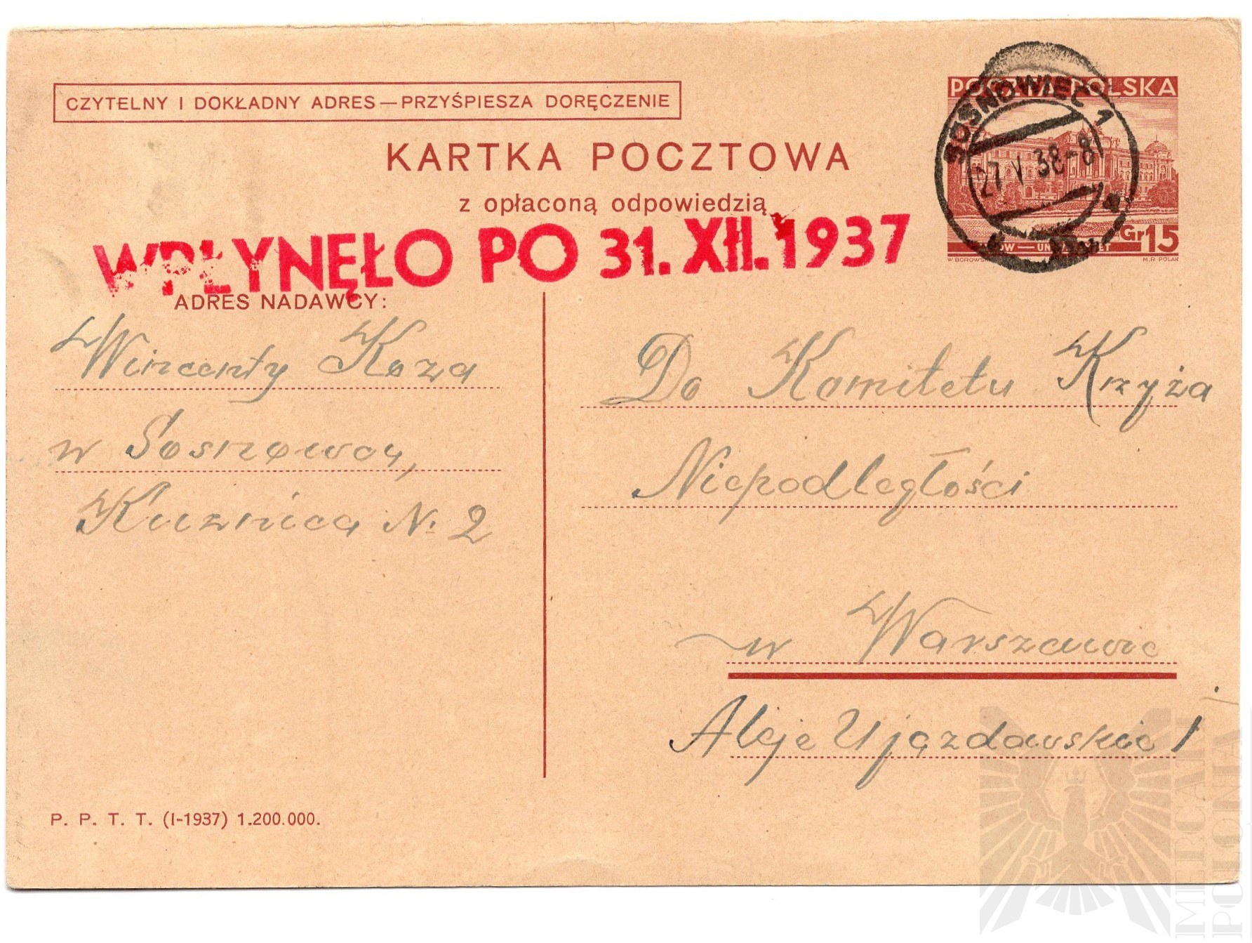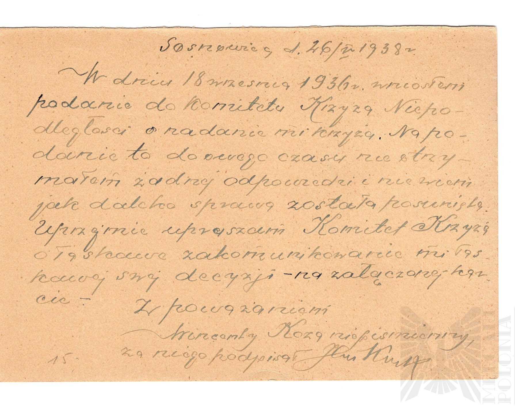 Kartka pocztowa wysłana przez Wincentego Kozę zamieszkałego w Sosnowcu adresowany do Komitetu Krzyża Niepodległości w Warszawie, jak możemy przeczytać z treści kartki autor informuje, że w dniu 18 września 1936 roku złożył wniosek do Komitetu Krzyża Niepodległości o nadanie odznaczenia. Do czasu napisania listu nie otrzymał żadnej odpowiedzi ani informacji o dalszym przebiegu sprawy. Autor uprzejmie prosi Komitet o udzielenie informacji o decyzji w jego sprawie.
