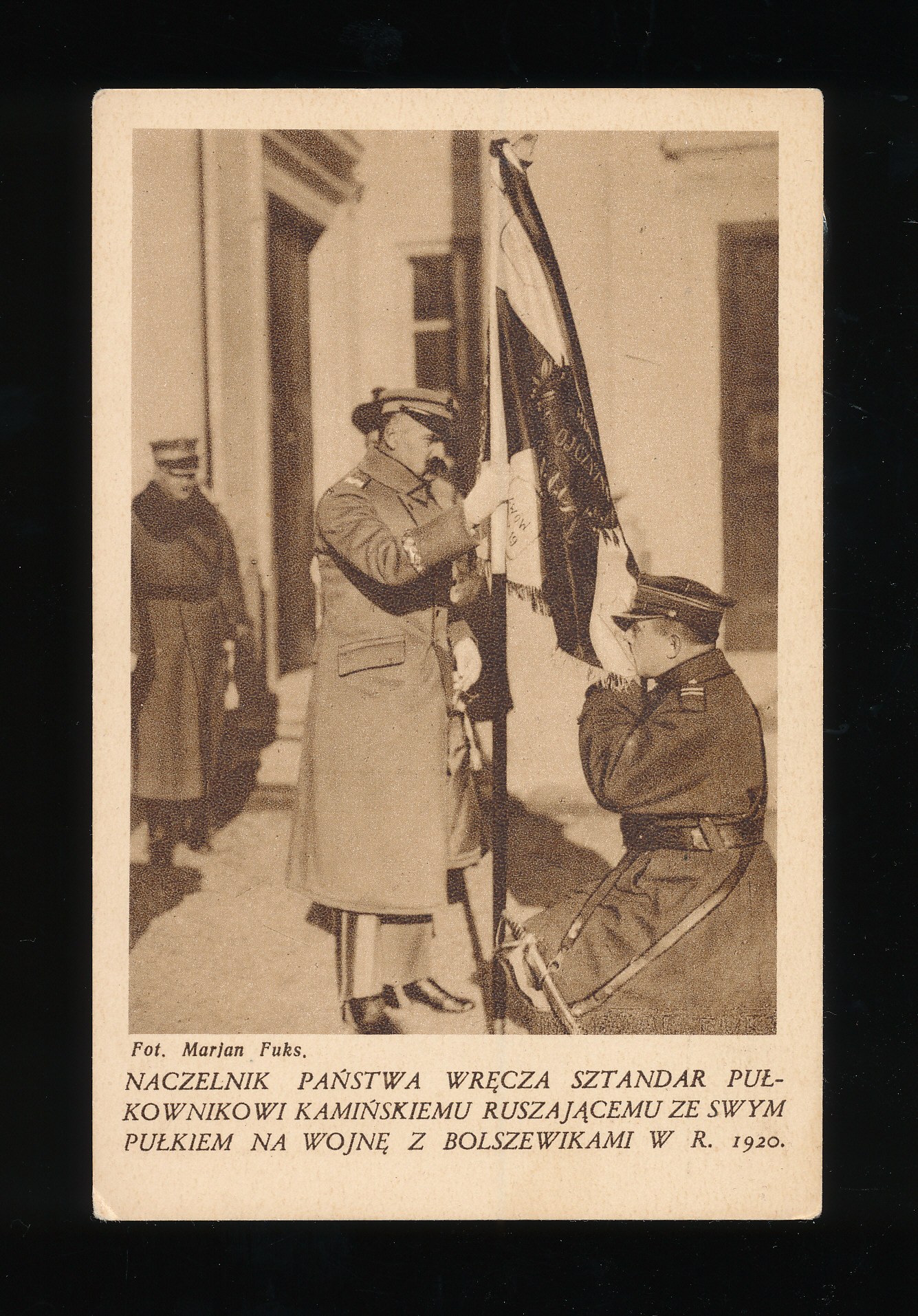 II Rp. „Naczelnik państwa wręcza sztandar pułkownikowi Kamińskiemu ruszającemu ze swym pułkiem na wojnę z bolszewikami w r. 1920”. Wydawca: Polonia, Kraków. Wym. 8,9 x 13,9 cm