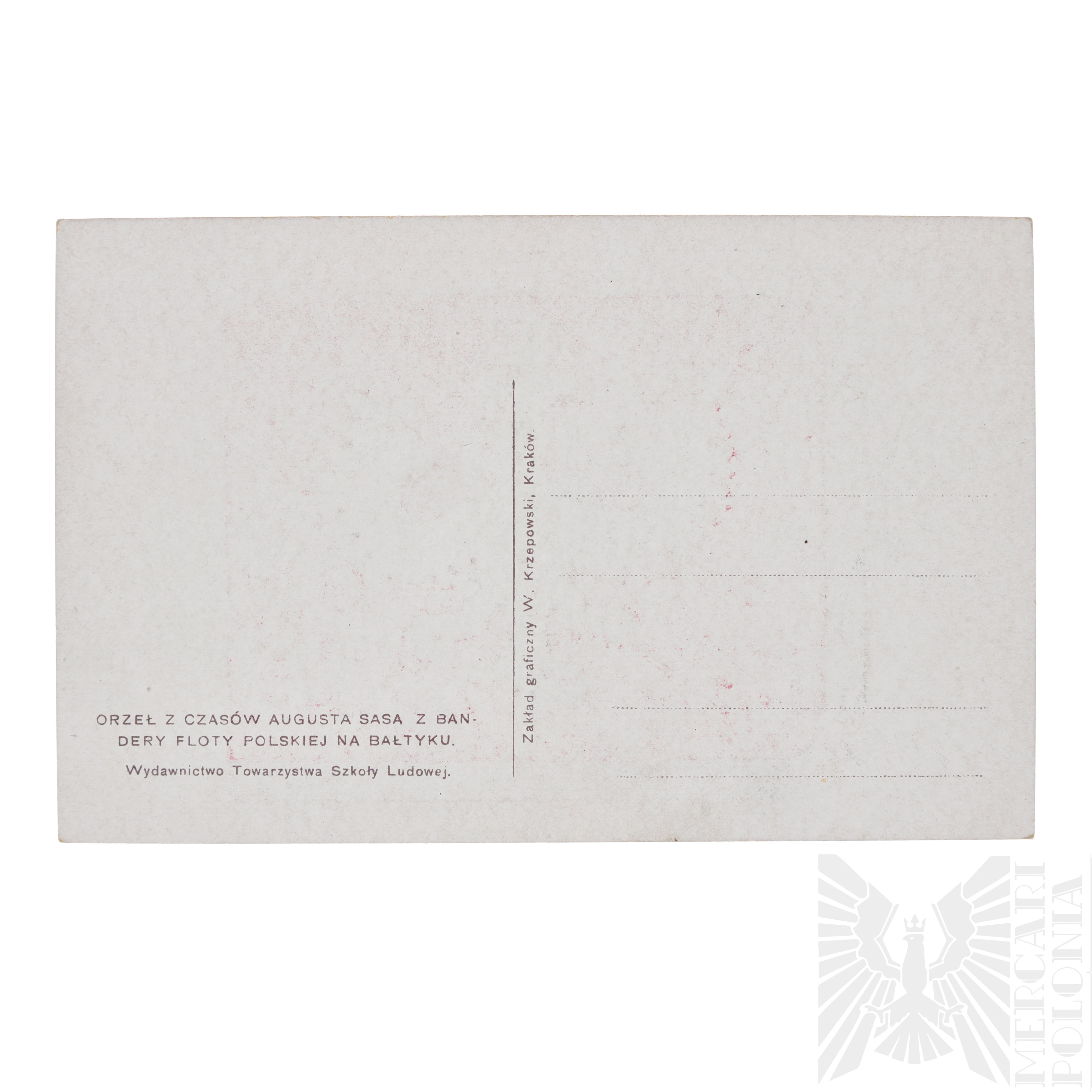 Pocztówka z wizerunkiem orła z bandery Floty Polskiej z czasów panowania Augusta Sasa. Pocztówka wydana przez Wydawnictwo Towarzystwa Szkoły Ludowej, drukarnia Zakład graficzny W. Krzepowski, Kraków.