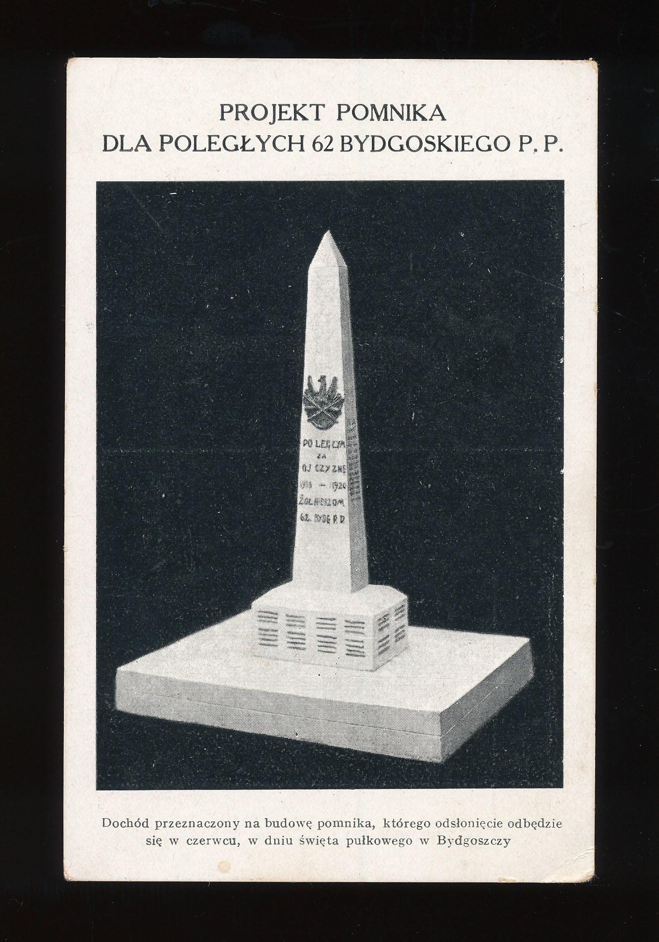 II Rp. „Projekt Pomnika dla Poległych 62 Bydgoskiego P.P.”. Wydawca: Zakł. Graf. „Bibljoteka Polska”, Bydgoszcz. Wym. 9 x 14,1 cm