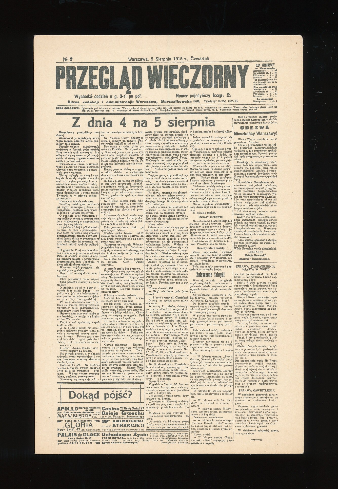 II Rp. „Przegląd Wieczorny”. Wydawca: Józef Brzeziński, Warszawa. Wym. 8,9 x 13,9 cm