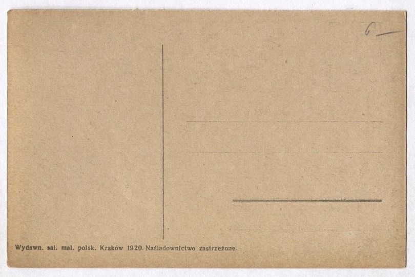 Wydawn. sal. mal. polsk. Kraków 1920. Kompozycja Kajetana Saryusza-Wolskiego (bez sygnatury): Orzeł Biały, pod nim herby Poznania, Krakowa i Warszawy. Pod kompozycją nadruk "Litogr. K. Kranikowski, Kraków". Bez korespondencji. Niewielkie zażółcenie wokół kompozycji, poza tym stan dobry.