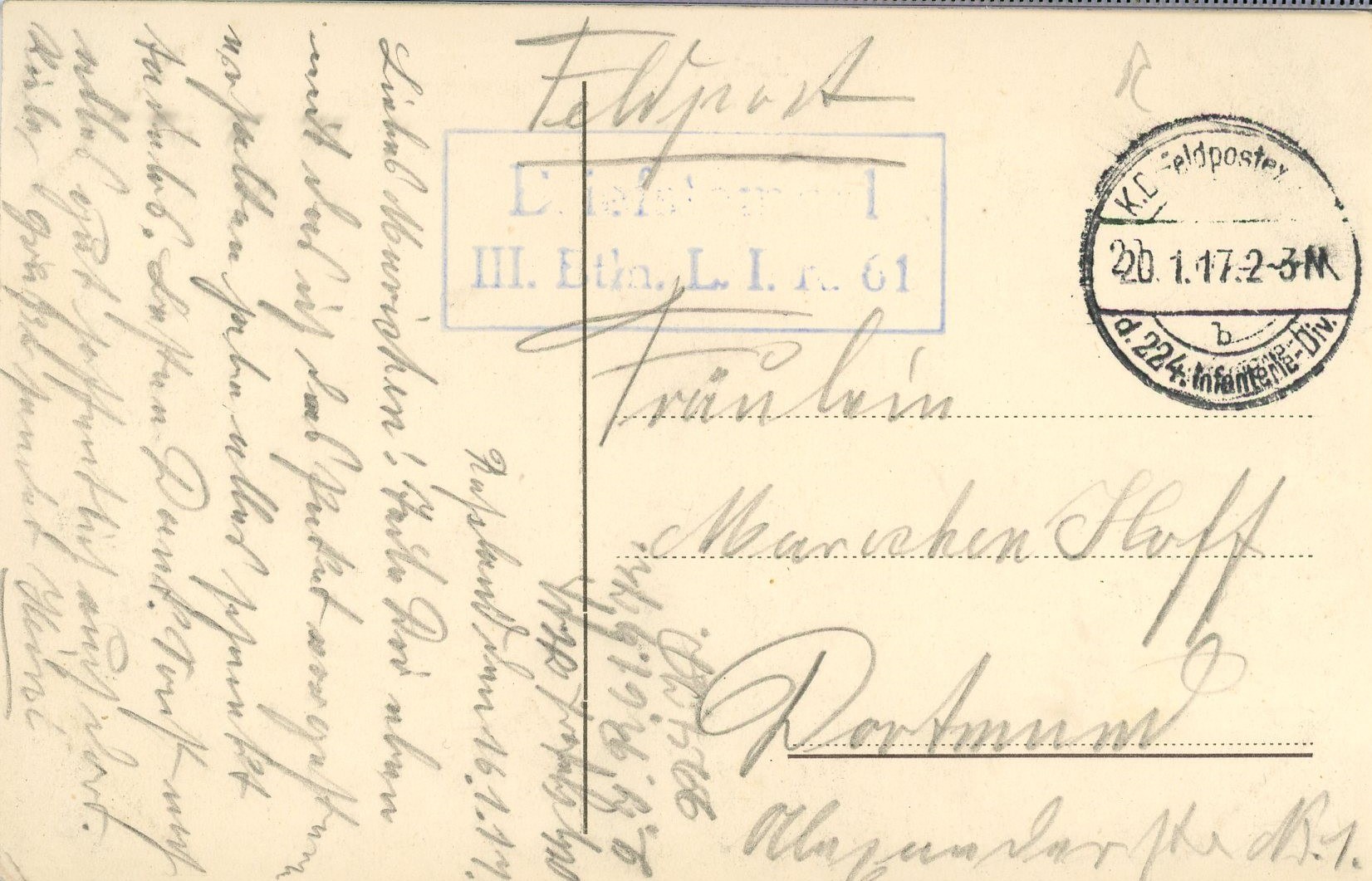 B. w. m. i r. Kartka zapisana, dat. 20.1.1917 r. Pieczęć K.u.k. Stan dobry. Rzadka.