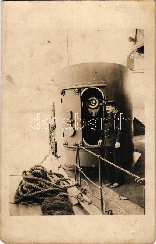 K.u.K. Kriegsmarine Donauflottille / Császári és Királyi Haditengerészet Dunaflottilla "BODROG" monitor fedélzete matrózzal a lövegtorony mellett / WWI Austro-Hungarian Navy Danube Fleet river guard monitor SMS BODROG, mariner on board stands next to the open sliding door of SMS BODROG's forward portside 4.7-inch (12-cm) gun turret, affording a good look at the gun's breech. photo (EM)
