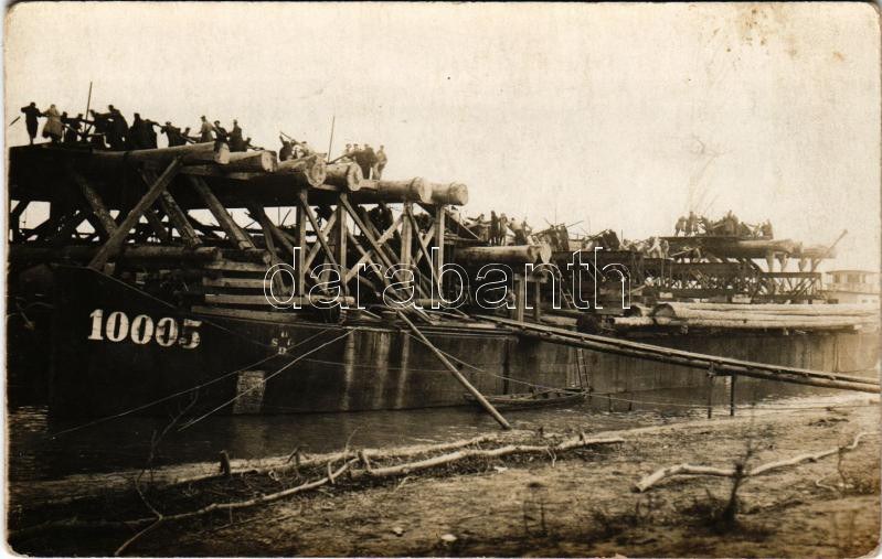 K.u.K. Kriegsmarine Donauflottille / Császári és Királyi Haditengerészet Dunaflottilla elsüllyedt "TEMES" (I) monitor kiemelése, DDSG 10005 uszály munkásokkal / WWI Austro-Hungarian Navy Danube Fleet sunken river guard monitor SMS TEMES (I) being raised, mid-June 1916. DDSG Barge 10005, laden with logs and workmen, is busily working to raise SMS TEMES. photo (kopott sarkak / worn corners)