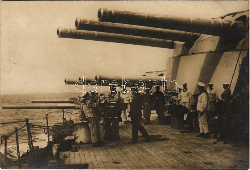 K.u.K. Kriegsmarine / Osztrák-magyar haditengerészet Tegetthoff-osztályú csatahajó fedélzeti védelmi fegyverek torpedók ellen / Austro-Hungarian Navy Tegetthoff-class battleship's Skoda 7.0 cm defense guns against torpedo attacks. photo (Rb)