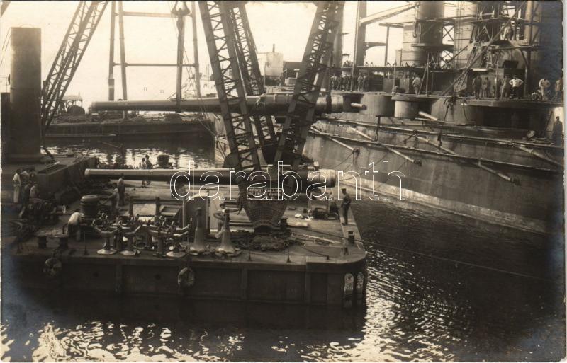 K.u.K. Kriegsmarine SMS Prinz Eugen Geschützeinsetzen / Osztrák-magyar haditengerészeti kikötő, fegyvertelepítés az SMS Prinz Eugen csatahajóra egy Bromovsky Schulz & Sohr úszó daruról / Austro-Hungarian Navy port, two 305-cm guns are about to be hoisted onto the awaiting SMS Prinz Eugen by a floating crane. Phot. Alois Beer, Schrinner 1915.