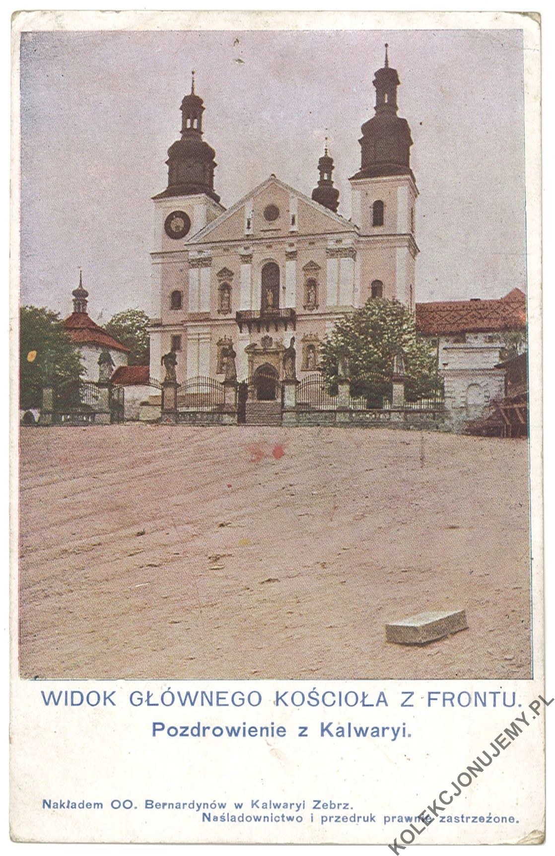 Opis: WIDOK GŁÓWNEGO KOŚCIOŁA Z FRONTU. Pozdrowienie z Kalwaryi (fot. T. Rząca)