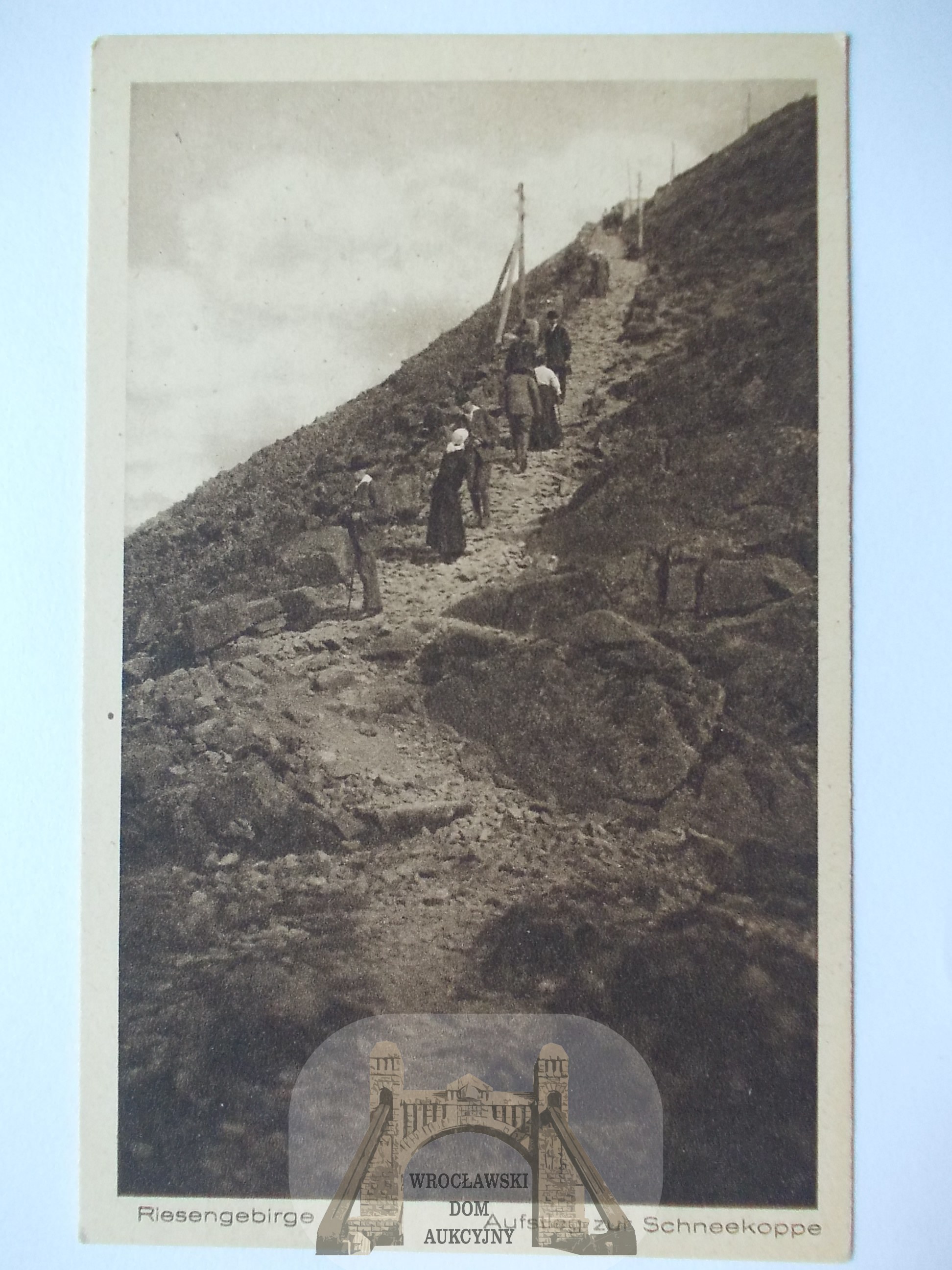 Karkonosze, Riesengebirge, wejście na Śnieżkę, turyści, ok. 1920