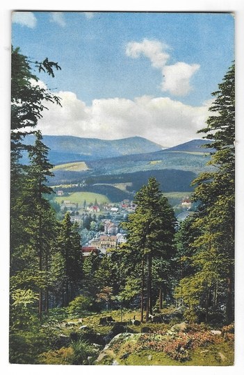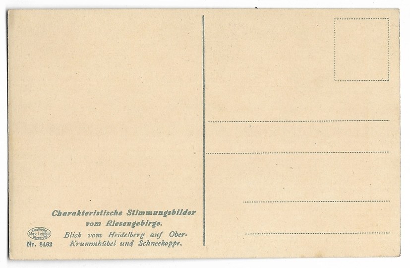 Kunstverlag Max Leipelt, Warmbrunn. Nr. 8462. Widok ze szczytu Karpatki na Karpacz i Śnieżkę. Bez korespondencji i znaczka. Stan bardzo dobry.