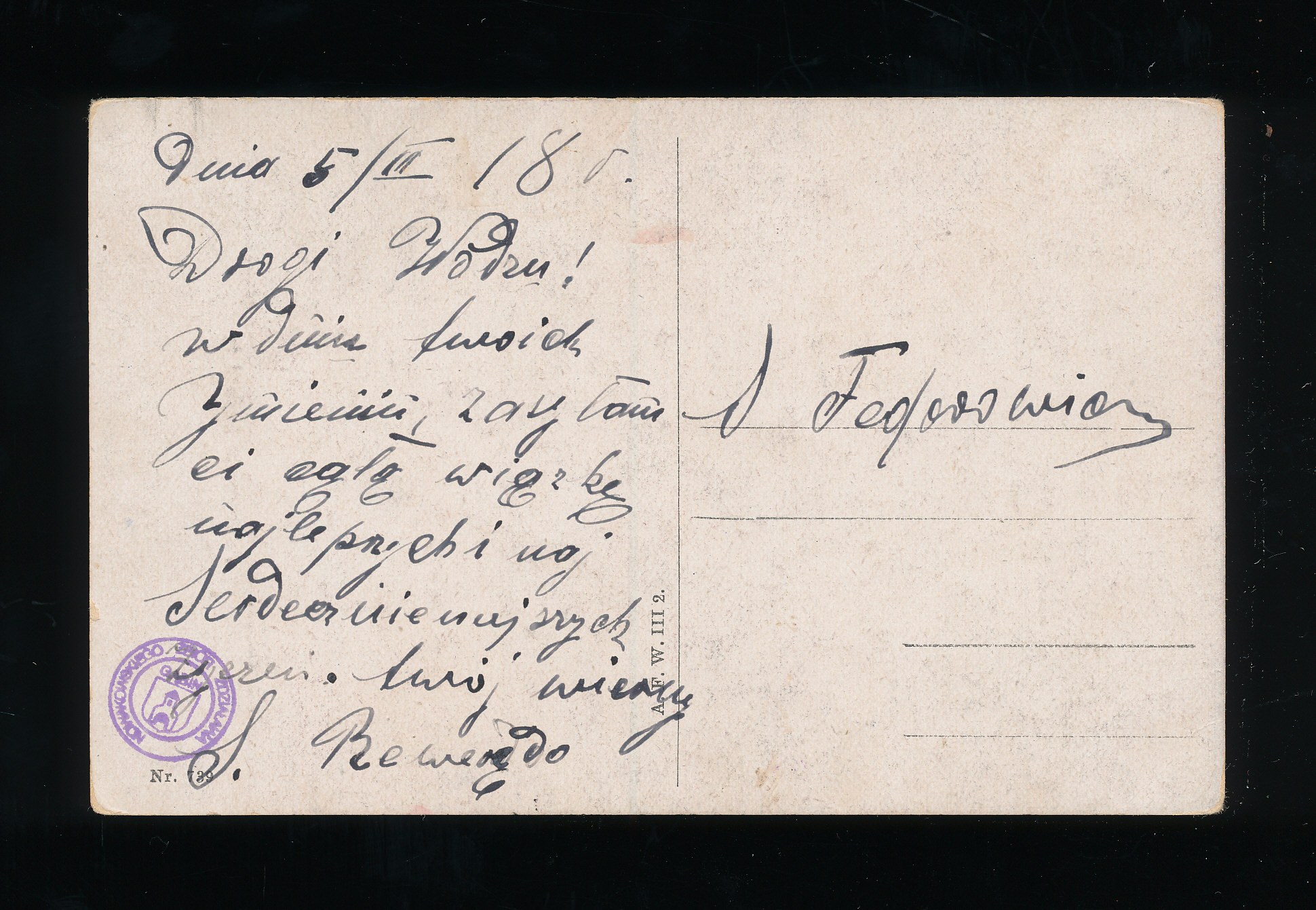 Pocztówka wysłana na imieniny do Brygadiera Józefa Piłsudskiego do Twierdzy Magdeburg w 1918 r. Pocztówka wysłana zapewne w korespondencji zbiorczej jakiejś patriotycznej organizacji dlatego jest brak stempla pocztowego. Stempel własnościowy Zdzisława Nowakowskiego twórcy Związku Piłsudczyków w Gąbinie i jego pierwszy prezes. „Pożegnanie legionisty”. Wym. 8,9 x 14,1 cm.