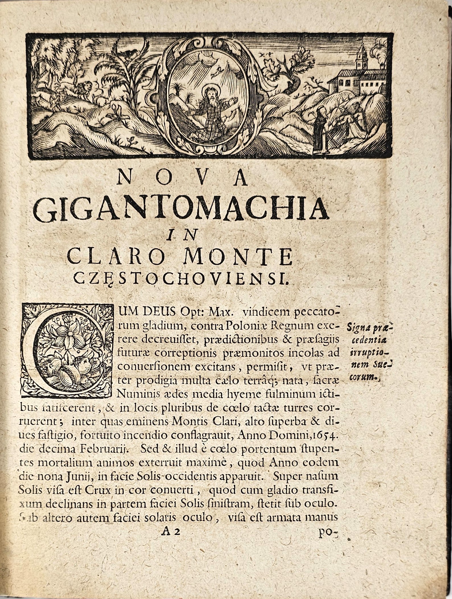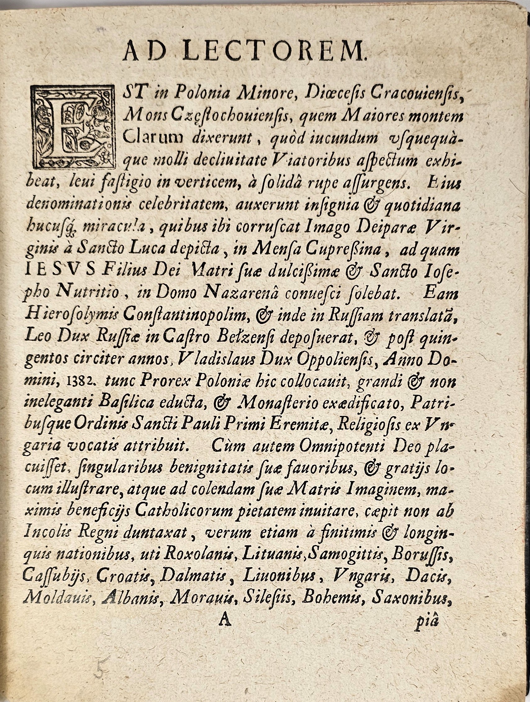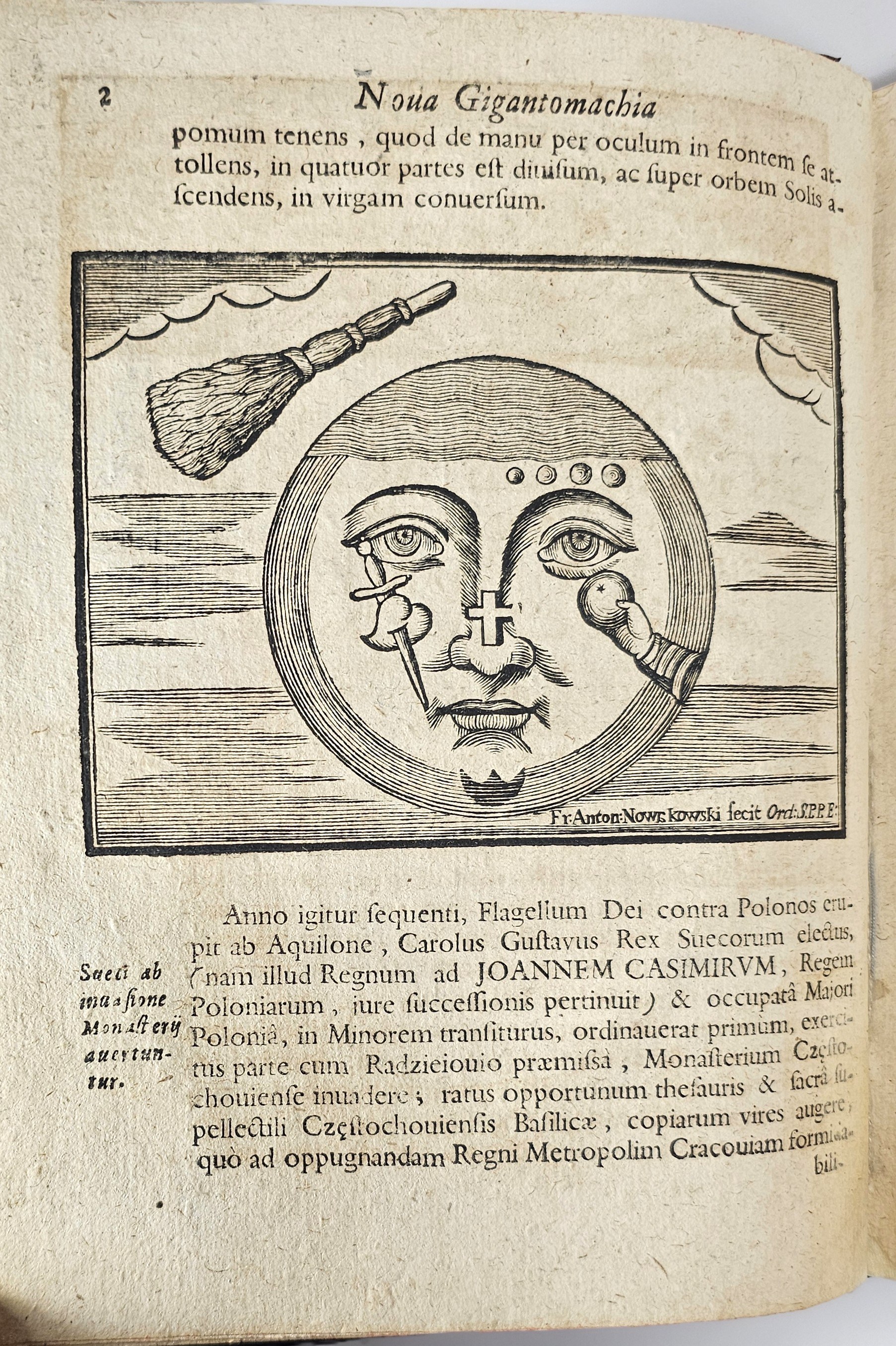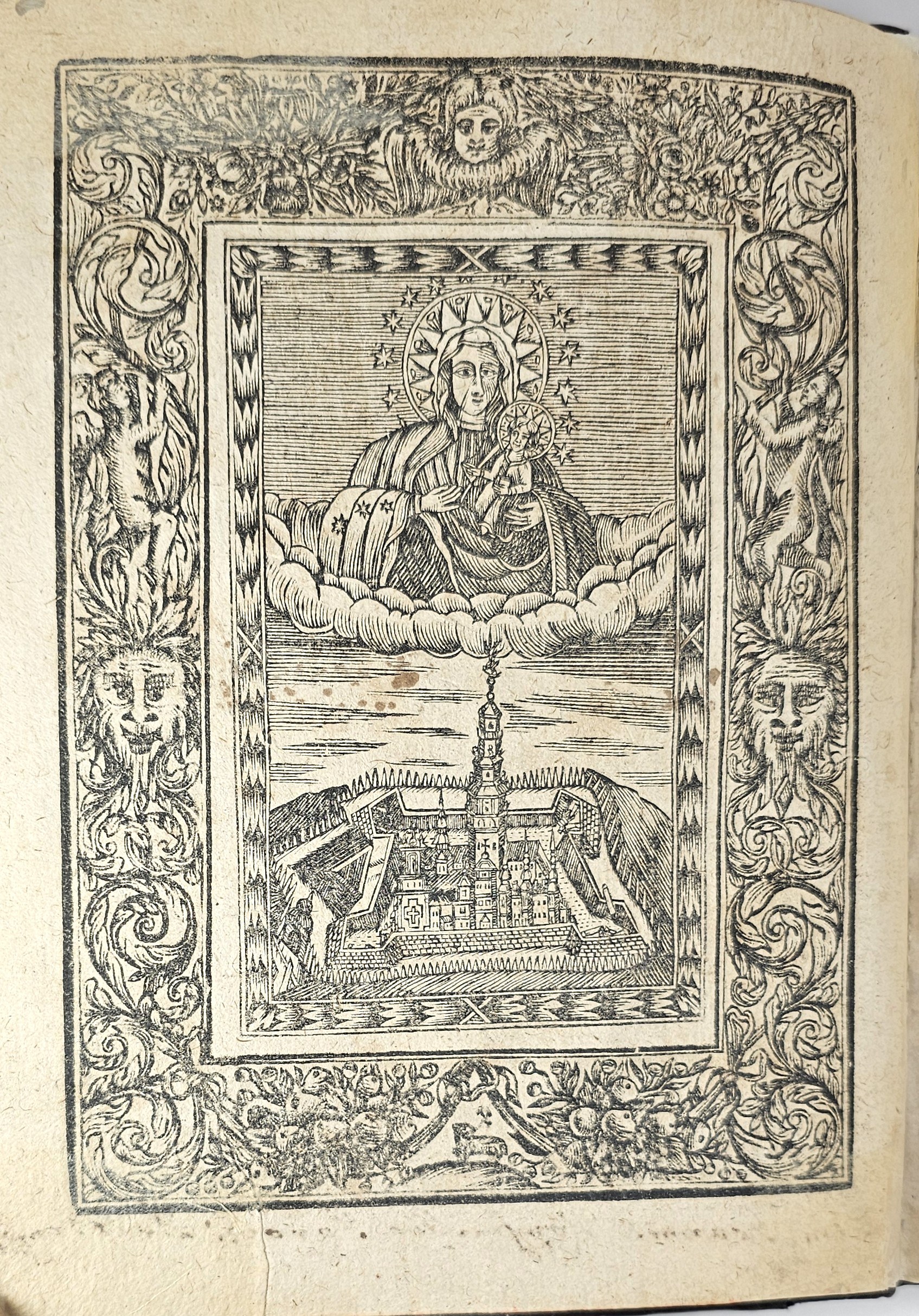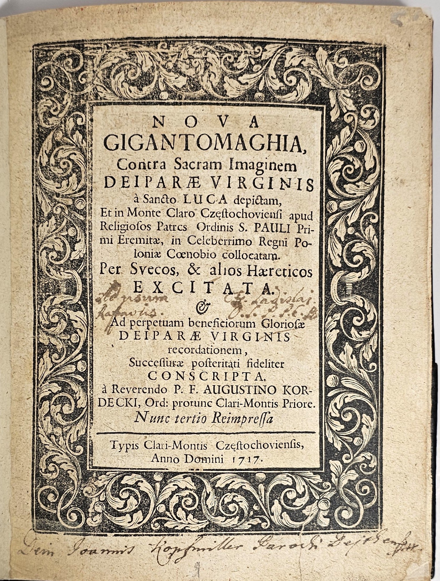 posteritati fideliter conscripta. á Reverendo ... , Ord: protunc Clari-Montis Priore. Nunc tertio Reimpessa. Typis Clari-Montis Częstochoviensis 1717. 8m (20 cm), s. [6], 146, ilustr.: 3 drzeworyty, opr. sk. z epoki, naprawiana: duże ubytki łącznie z grzbietem uzupełnione skórą, egzemplarz po fachowej naprawie. Stan dobry. Karta tytuł. w ozdobnej ramce z ornamentem roślinnym, na odwrociu k. tytuł. drzeworyt z przedstawieniem Matki Boskiej Częstochowskiej i klasztoru jasnogórskiego (niesygnowany). Na str. 2: drzeworyt sygnowany Fr.Anton:Nowakowski fecit Ord:S.P.P.E: Na str. 111: drzeworyt z widokiem Jasnej Góry, sygnowany: