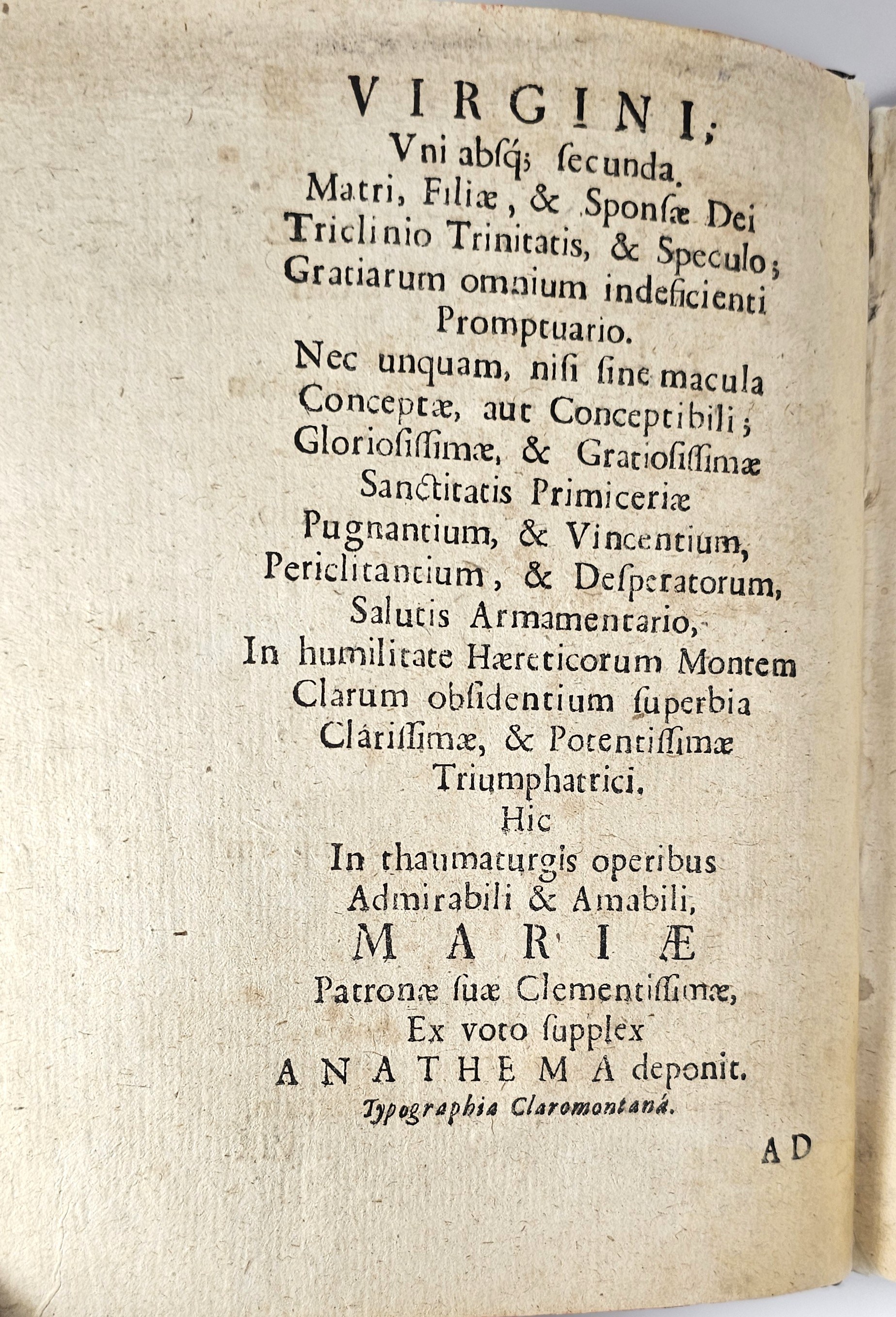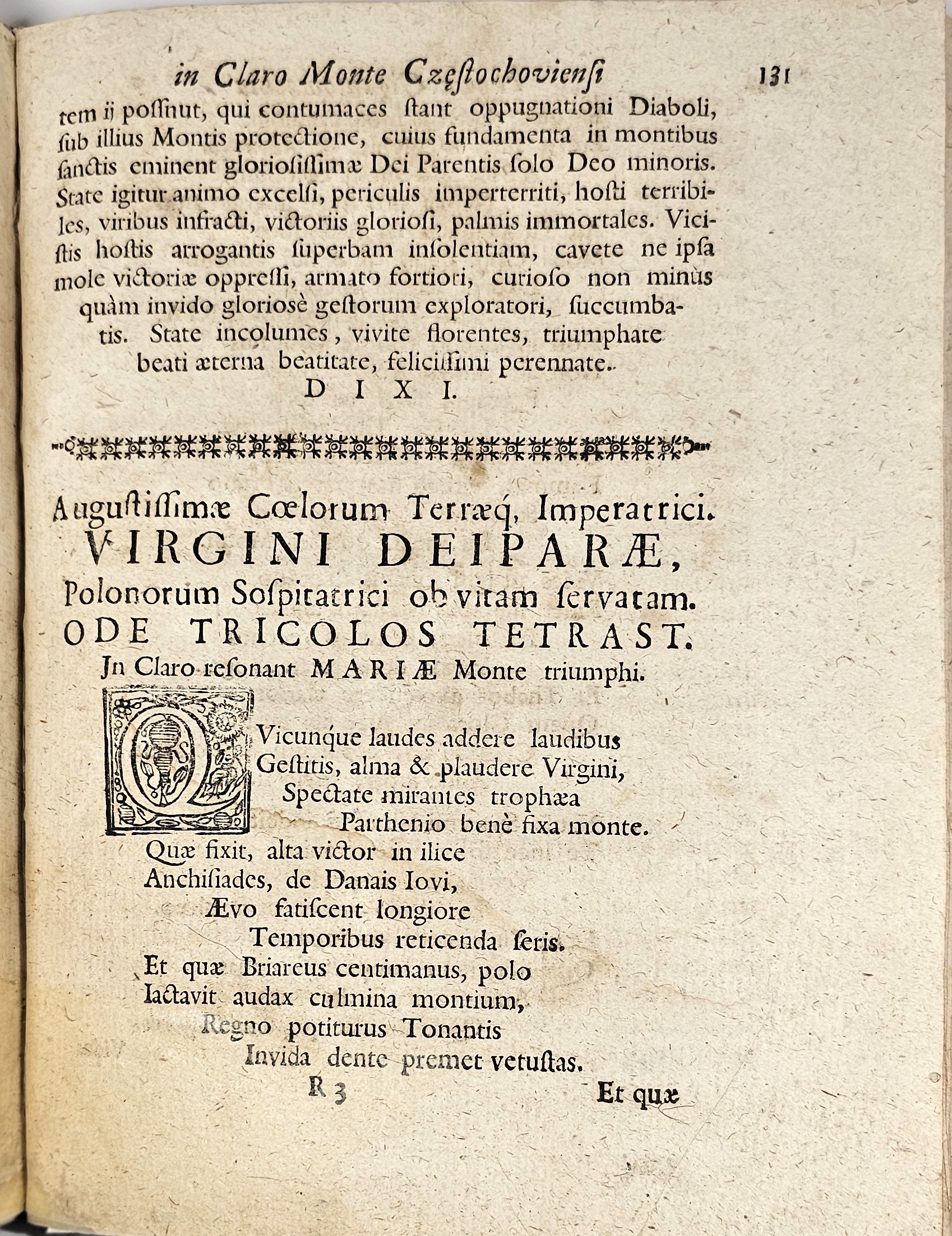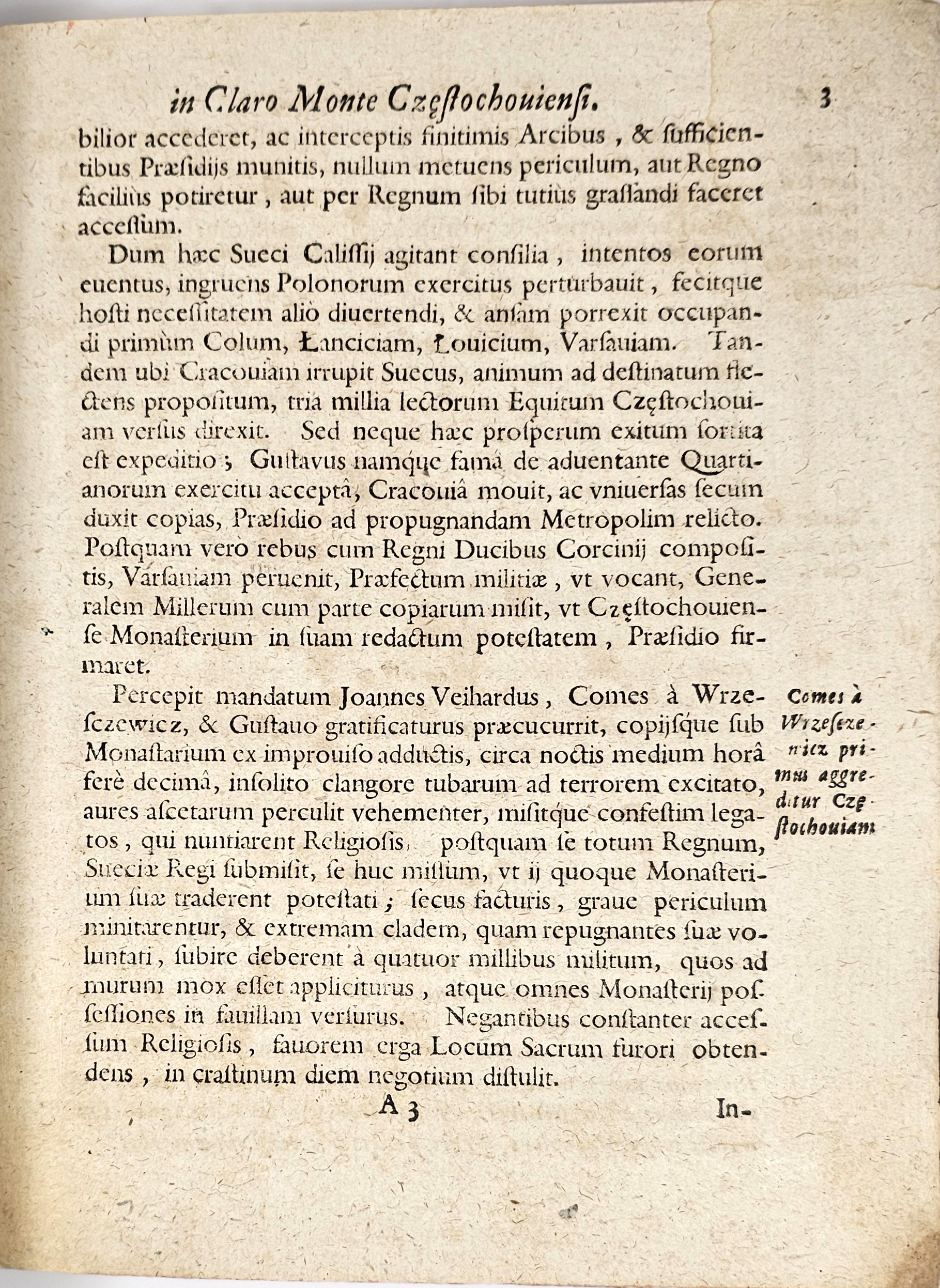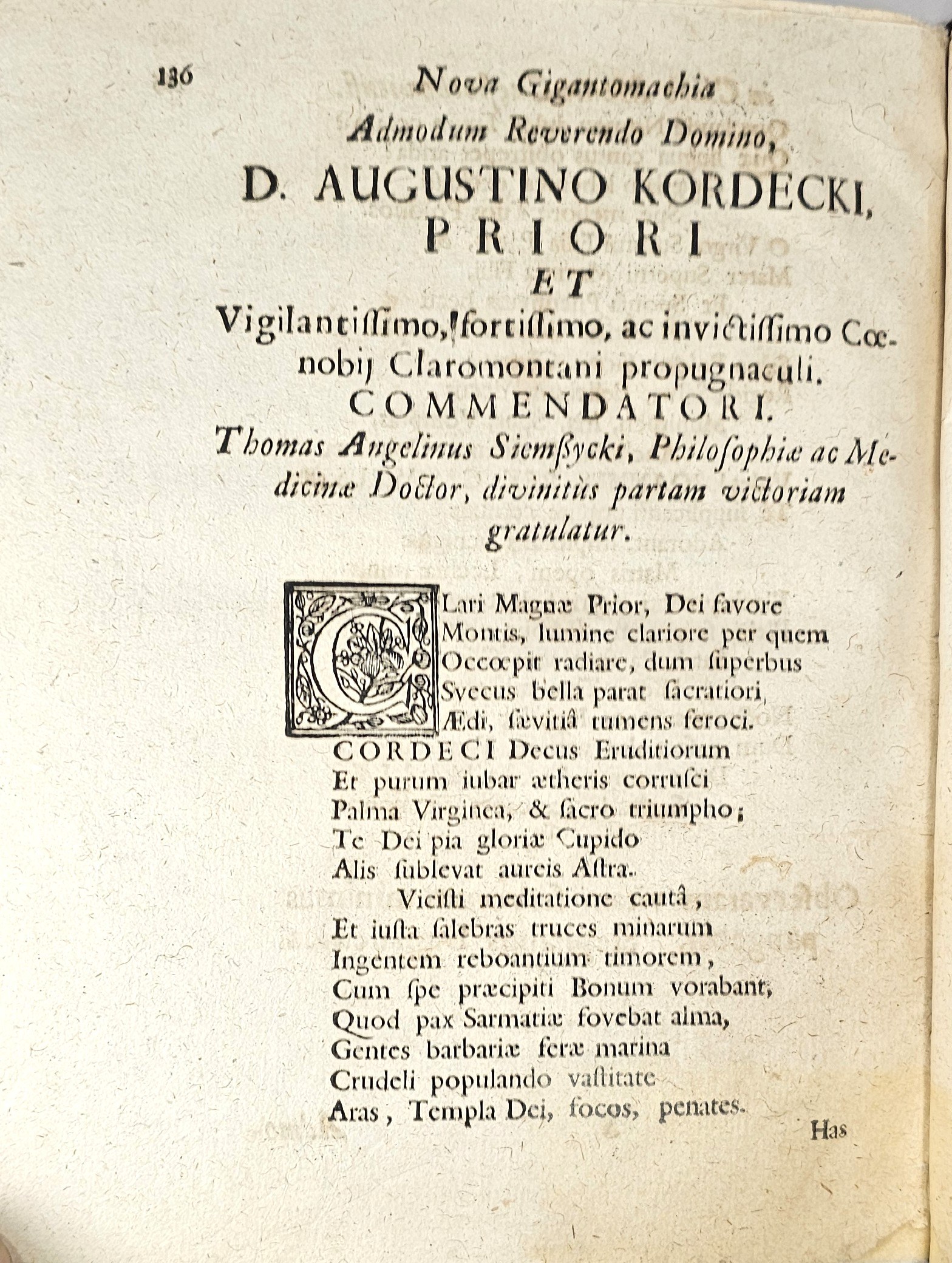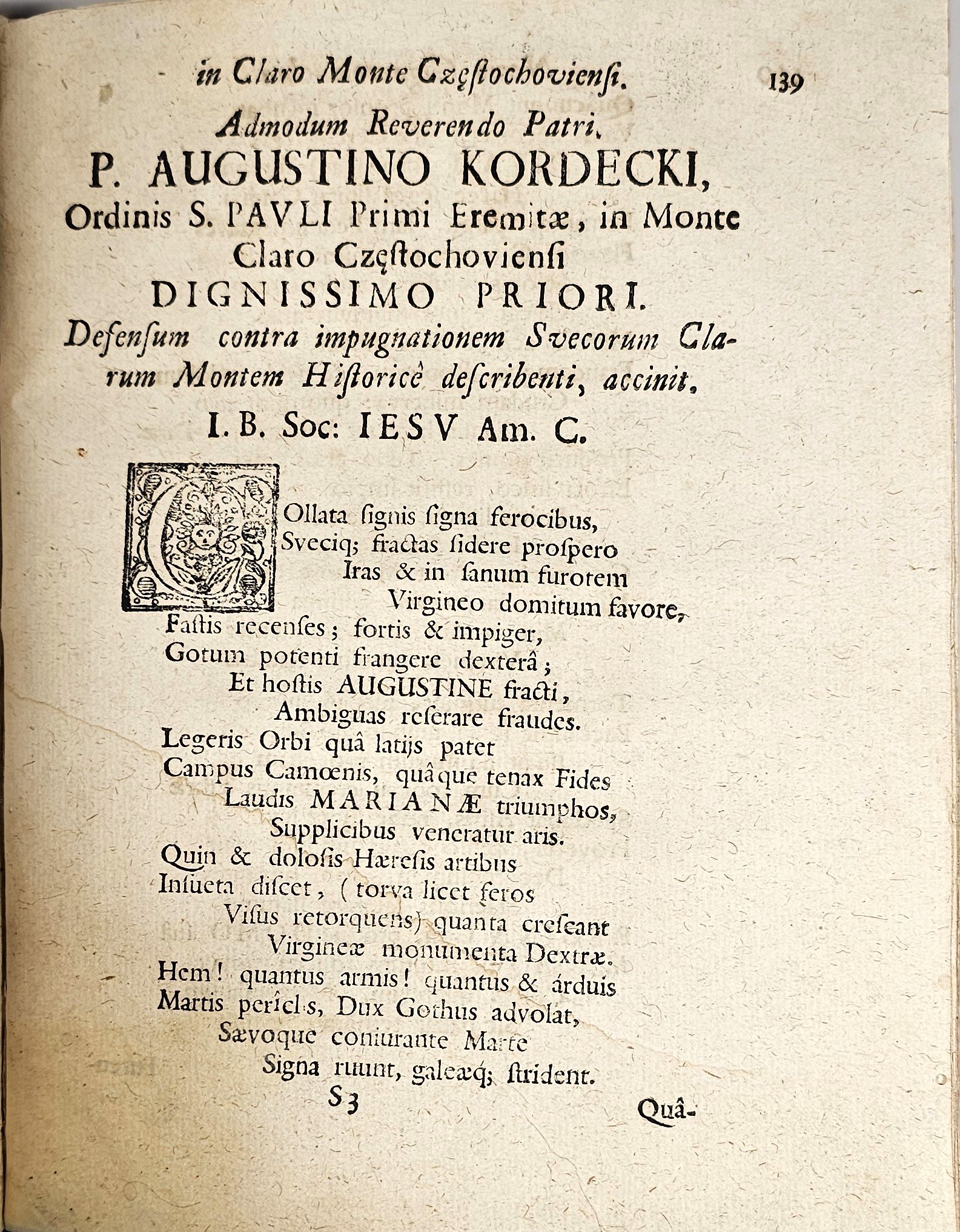 posteritati fideliter conscripta. á Reverendo ... , Ord: protunc Clari-Montis Priore. Nunc tertio Reimpessa. Typis Clari-Montis Częstochoviensis 1717. 8m (20 cm), s. [6], 146, ilustr.: 3 drzeworyty, opr. sk. z epoki, naprawiana: duże ubytki łącznie z grzbietem uzupełnione skórą, egzemplarz po fachowej naprawie. Stan dobry. Karta tytuł. w ozdobnej ramce z ornamentem roślinnym, na odwrociu k. tytuł. drzeworyt z przedstawieniem Matki Boskiej Częstochowskiej i klasztoru jasnogórskiego (niesygnowany). Na str. 2: drzeworyt sygnowany Fr.Anton:Nowakowski fecit Ord:S.P.P.E: Na str. 111: drzeworyt z widokiem Jasnej Góry, sygnowany: