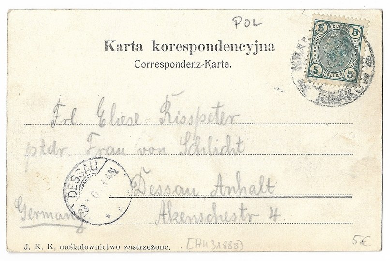 J.K.K. [= J. Klein, Kraków]. Przełom XIX/XX w. Z korespondencją i znaczkiem. Daty stempli nieczytelne. Niewielkie zaplamienia.