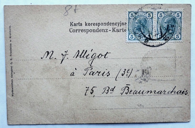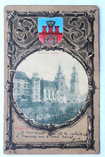 K. 109. Wydawnictwo Księgarni D. E. Friedleina w Krakowie. Pocztówka z długą linią adresową. Z korespondencją dat.: "19. 8. 90", dwoma znaczkami i stemplem pocztowym. Miejscowe otarcia, stan ogólny dobry.
