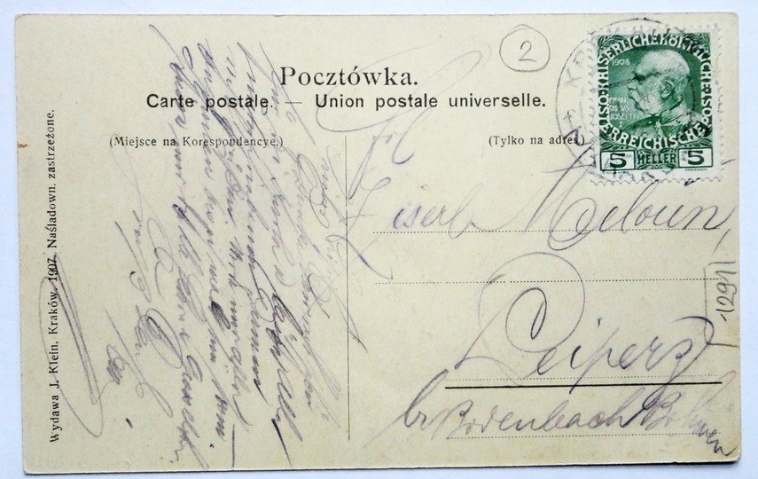 Wydawa [!] J. Klein, Kraków 1907. Z korespondencją, znaczkiem i stemplem pocztowym. Stan bardzo dobry.