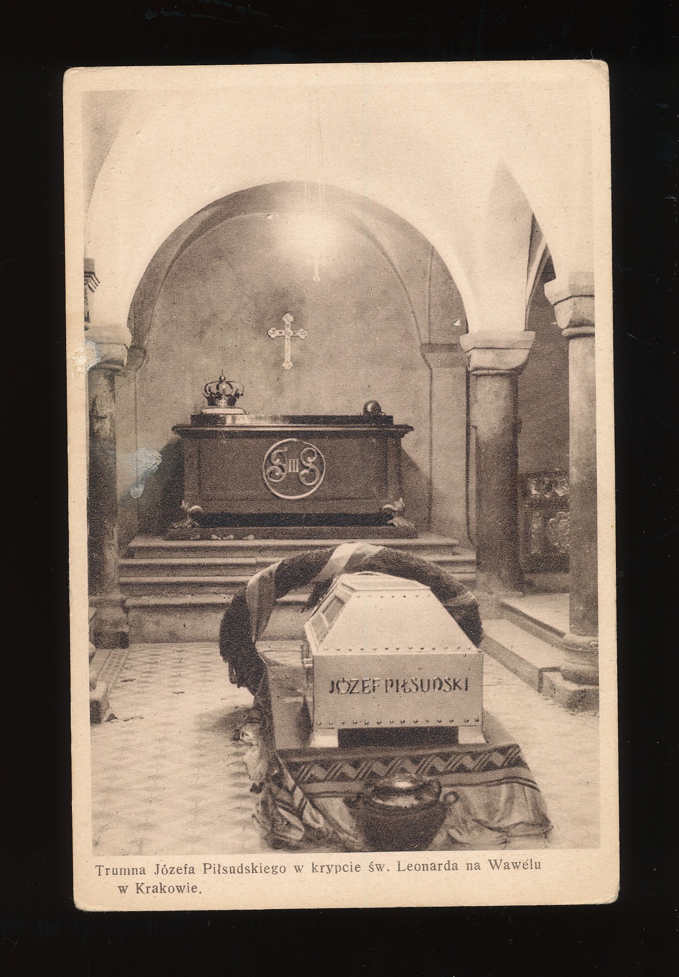 Kraków. „Trumna Józefa Piłsudskiego w krypcie św. Leonarda na Wawelu”. Wydwaca: Polonia, Kraków. Wym. 9 x 14 cm