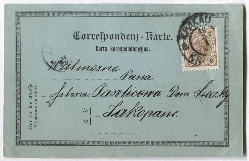 Bez danych wydawniczych. Z korespondencją i znaczkiem. Data listu: 11 VIII 1899. Niewielkie załamanie i otarcia górnej krawędzi, lekkie zagniecenia narożników - efekt przetrzymywania pocztówki w albumie.