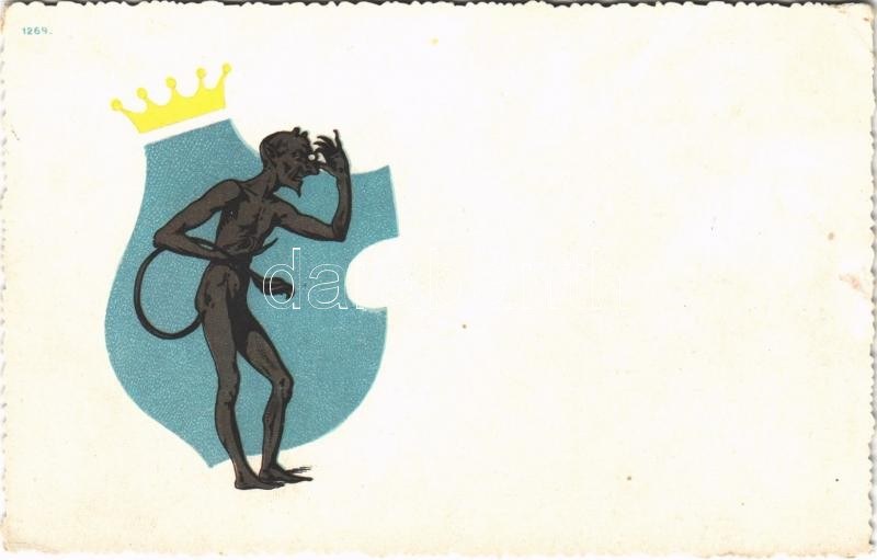 Krampusz koronás címerrel / Krampus with crowned coat of arms. litho