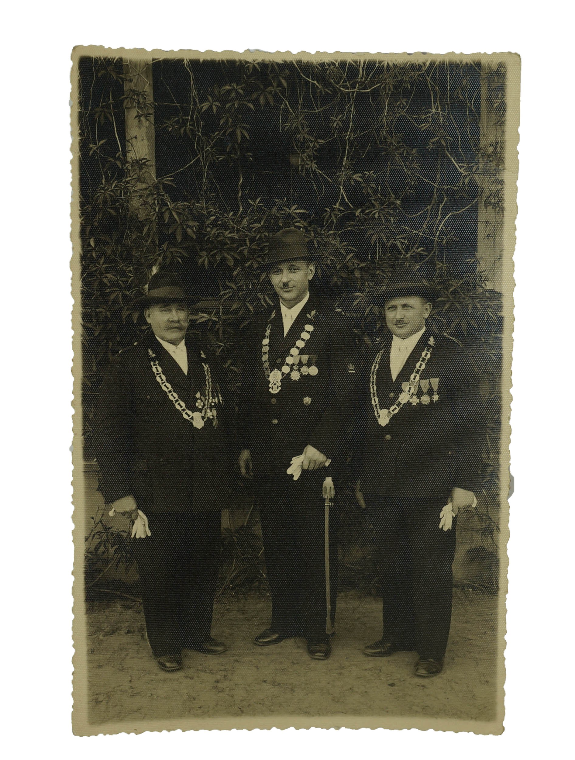 Kurkowe Bractwo Strzelecki w Ostrowie , członkowie w pełnej gali orderowej z łańcuchami, fot. M. Malikowa Ostrów Wielkopolski, f. 8,5 x 13,5cm