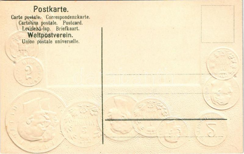 La Servie / Set of coins, currency exchange chart and flag of Serbia. H.S.M. Emb. litho (lyukak / pinholes)