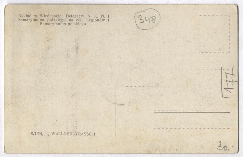 Nakładem Wiedeńskiej Delegacyi N.K.N. i Samarytanina polskiego na cele Legionów i Samarytanina polskiego. Wien, I., Wallnerstrasse. Bez korespondencji i znaczka. Otarcia.