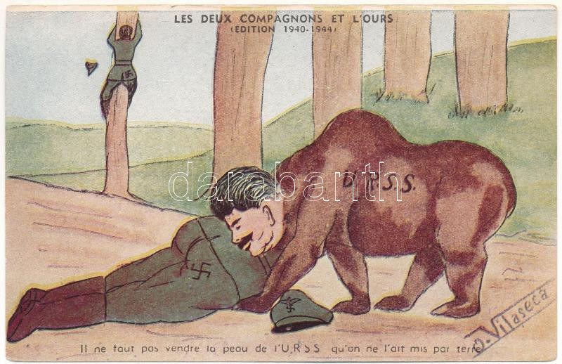 Les Deux Compagnons et L'Ours (Edition 1940-1944). Il ne tout pas vendre la peau de l'URSS qu'on ne l'ait mis par terre / Második világháborús náciellenes gúnyos propaganda a nagy szovjet medvével / WWII anti-Nazi military mocking propaganda with the Soviet bear s: O. Vilaseca (EK)