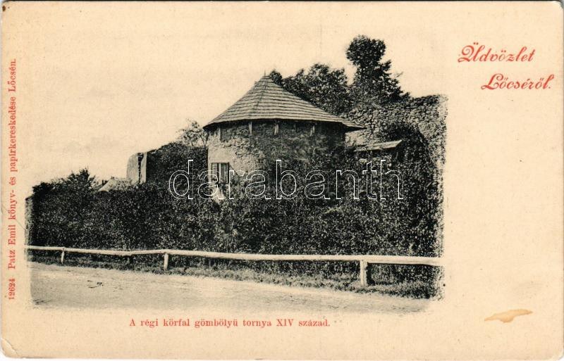 Lőcse, Levoca; A régi körfal gömbölyű tornya XIV. század. Patz Emil kiadása / city wall ruins from the 14th century...