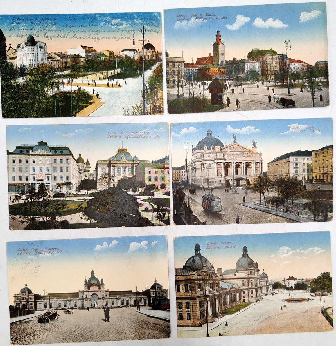 Lot 6 pocztówek : Lwów - Lemberg - Plac Św. Ducha, Dworzec i inne