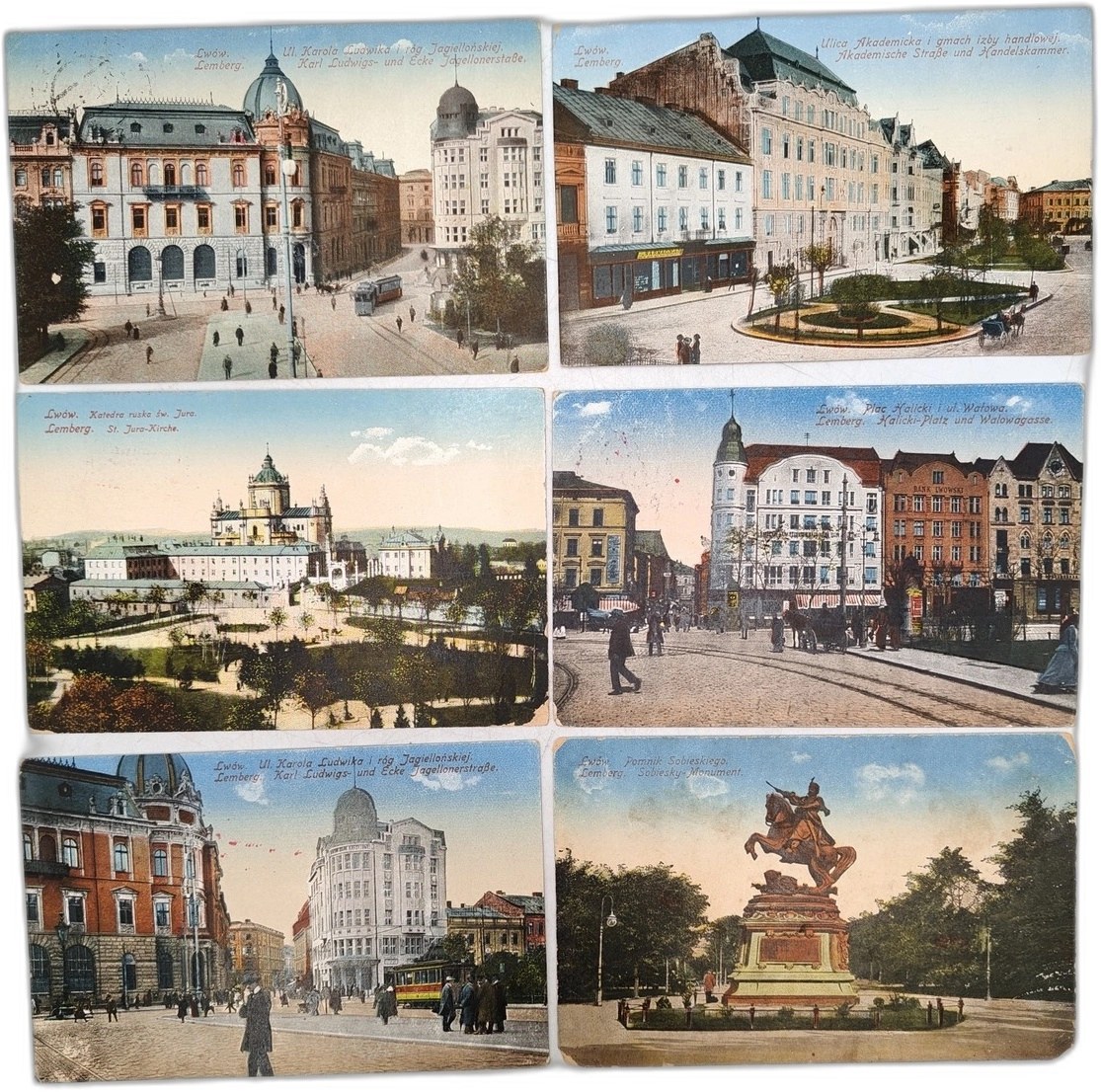 Lot 6 pocztówek : Lwów - Lemberg - Pomnik Sobieskiego, Katedra ruska św. Jura