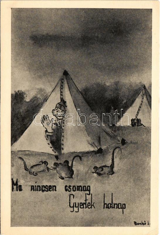 Ma nincsen csomag - gyertek holnap. Magyar cserkész művészlap egerekkel. Martineum Rt. Szombathely / Hungarian boy scout art postcard with mice s: Benkő L. (vágott / cut)