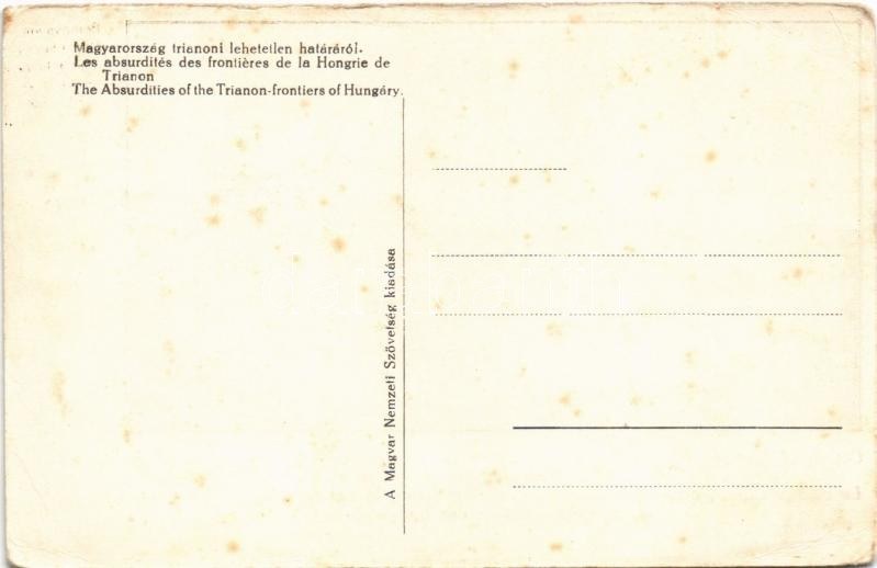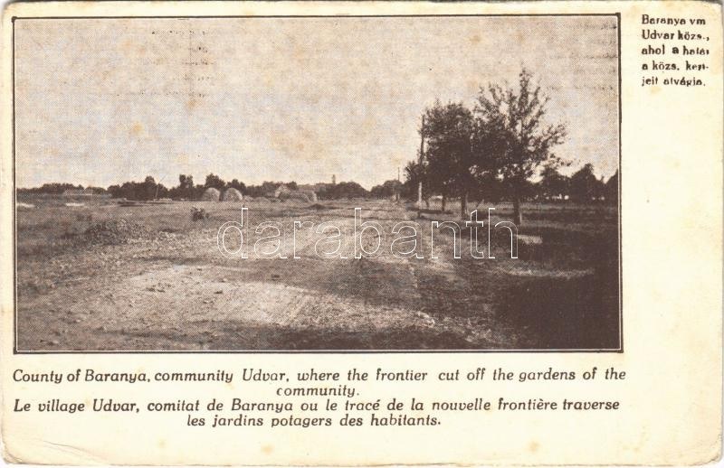 Magyarország trianoni lehetetlen határáról. Baranya vm. Udvar község, ahol a határ a község kertjeit átvágja. Magyar Nemzeti Szövetség kiadása / The impossible borders of Hungary after Trianon, irredenta propaganda (EK)