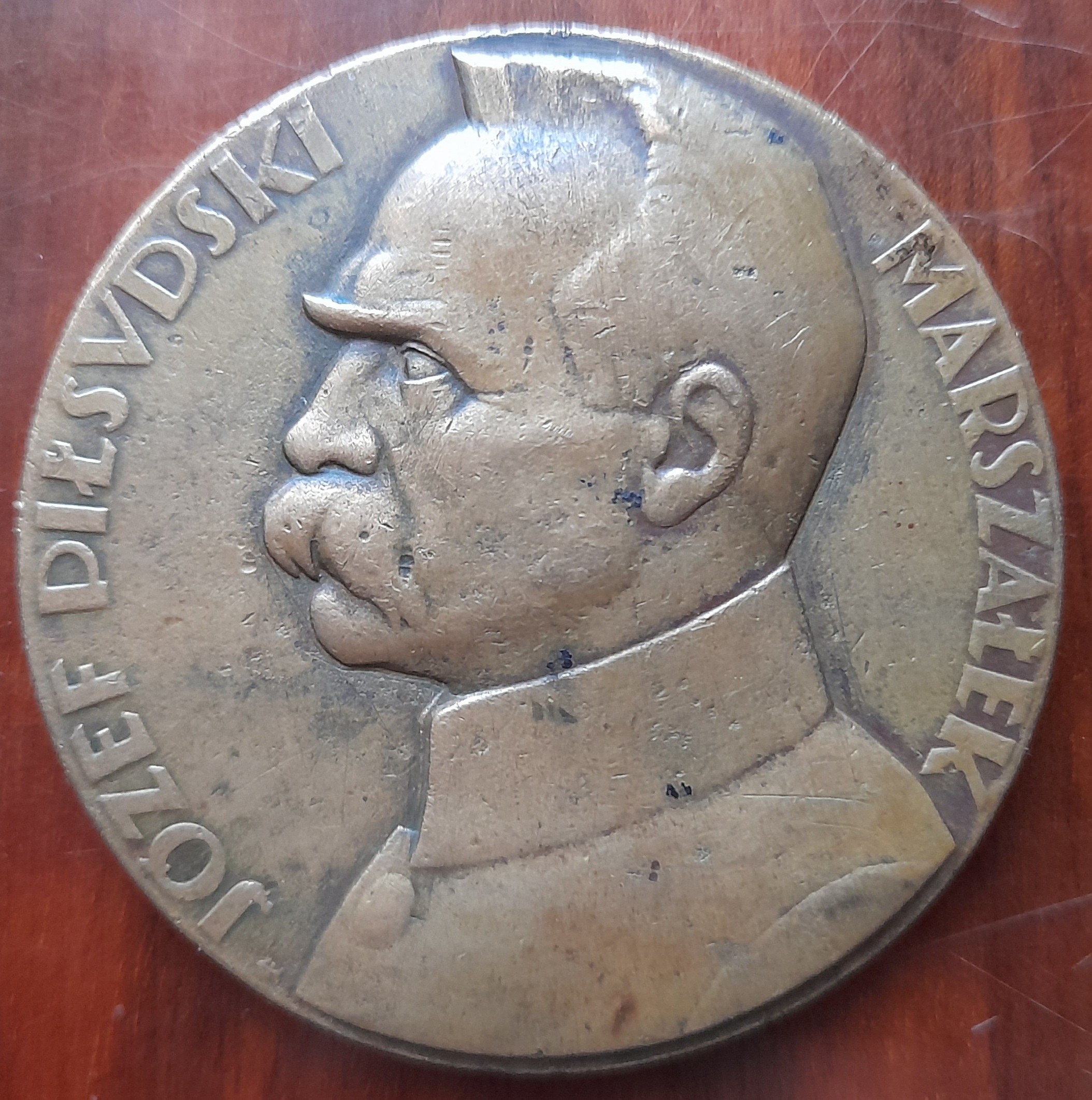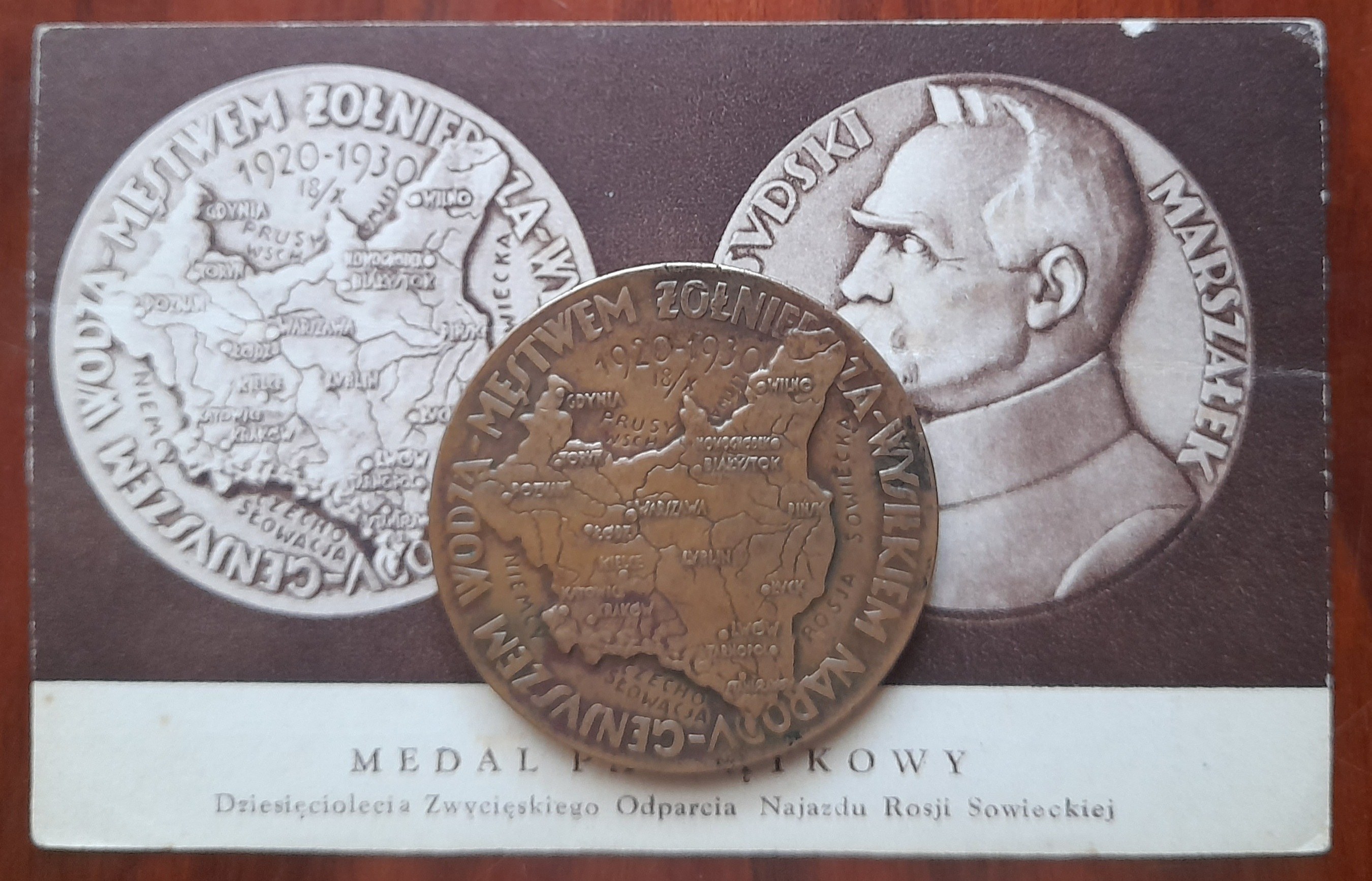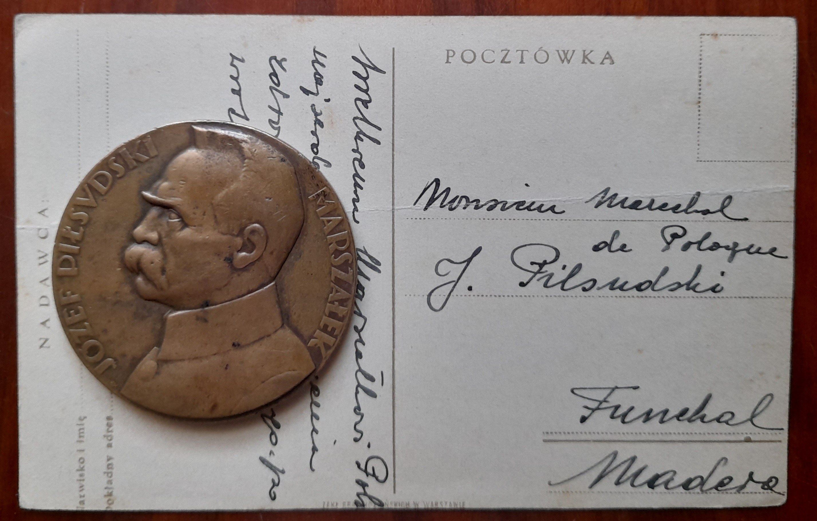 Medal i pocztówka pisana do Józefa Piłsudskiego na Maderze.