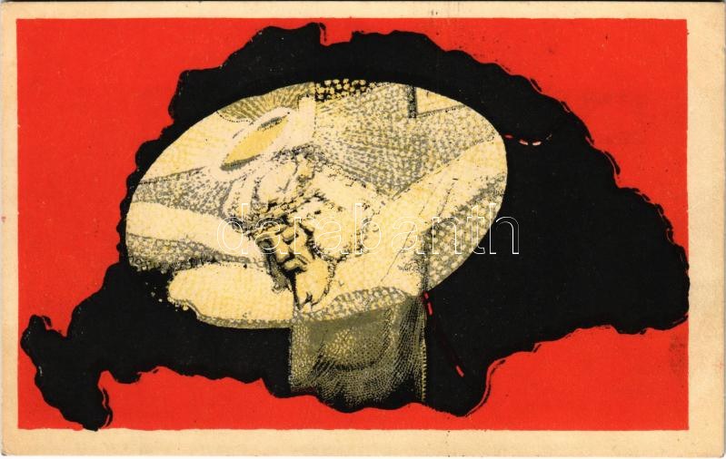 Megostoroztatott, kigúnyoltatott és keresztre feszíttetett. Kiadja Magyarország Területi Épségének Védelmi Ligája. Besskó Károly Grafikai Műintézete / "Hungary flogged, jeered and crucified" Hungarian irredenta propaganda s: Kardos Brunó
