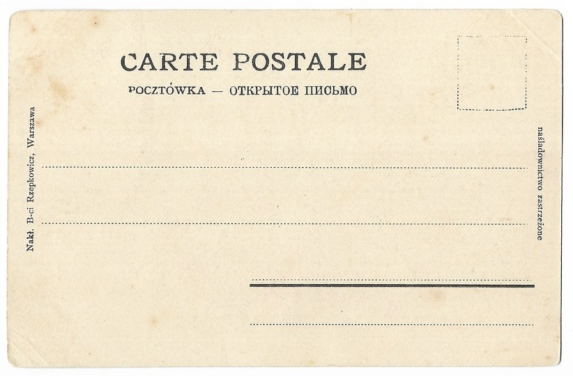 Nakł. B-ci Rzepkowicz, Warszawa. Nie po 1905. Bez korespondencji i znaczka. Otarcia narożników, niewielkie załamanie górnego narożnika, drobne zabrudzenia na odwrocie, poza tym stan dobry.