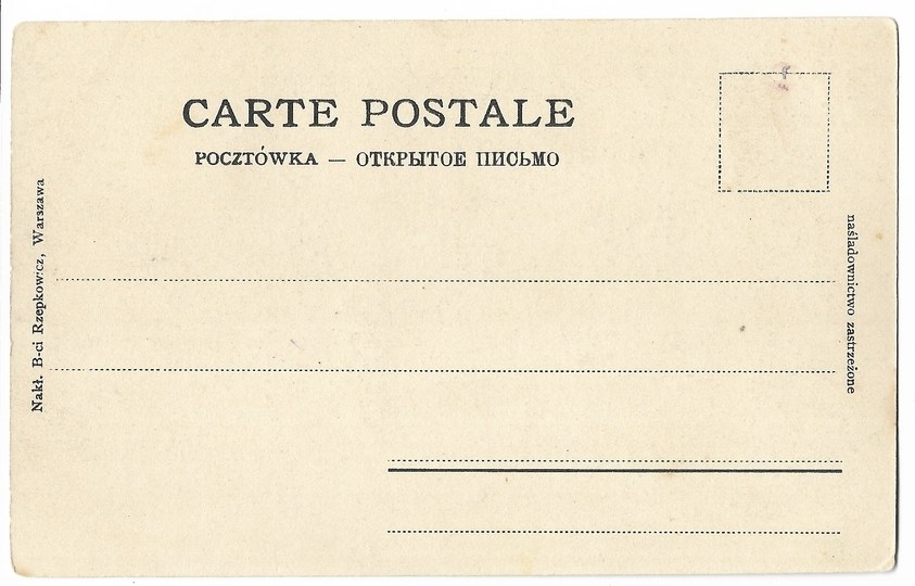 Nakł. B-ci Rzepkowicz, Warszawa. Nie po 1905. Bez korespondencji i znaczka. Otarcia narożników, poza tym stan dobry.