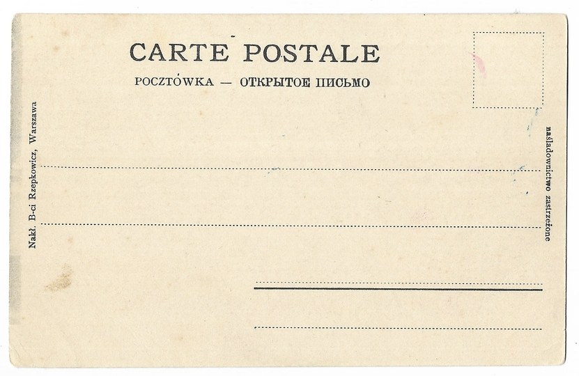 Nakł. B-ci Rzepkowicz, Warszawa. Nie po 1905. Bez korespondencji i znaczka. Otarcia narożników, niewielkie zaplamienia na odwrocie, mimo to stan dobry.