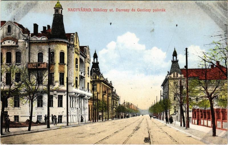 Nagyvárad, Oradea; Rákóczi utca, Darvasi és Gerliczy paloták. Boros Jenő kiadása / street, palaces