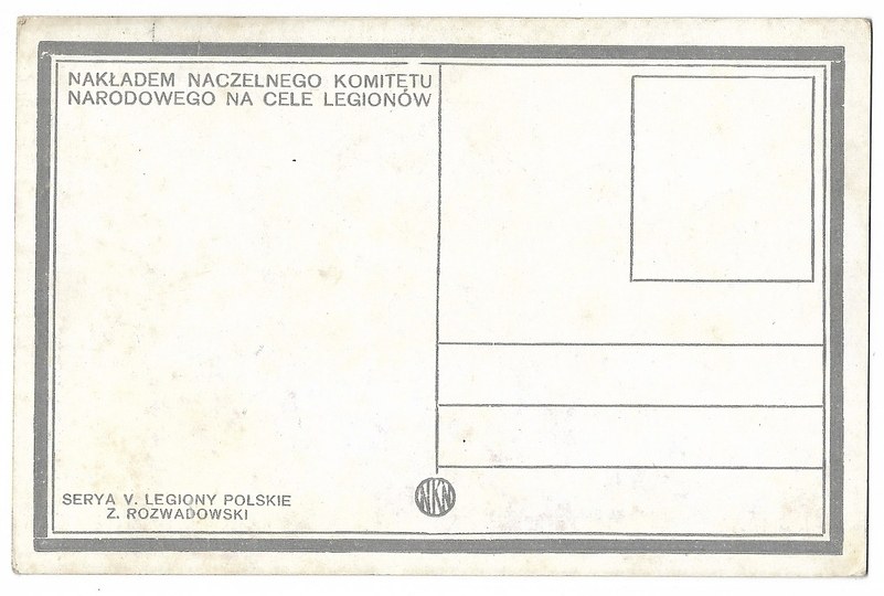 Nakładem Naczelnego Komitetu Narodowego na cele Legionów. Reprodukcja obrazu Zygmunta Rozwadowskiego. Bez korespondencji i znaczka. Niewielkie zaplamienia, stan ogólny dobry.