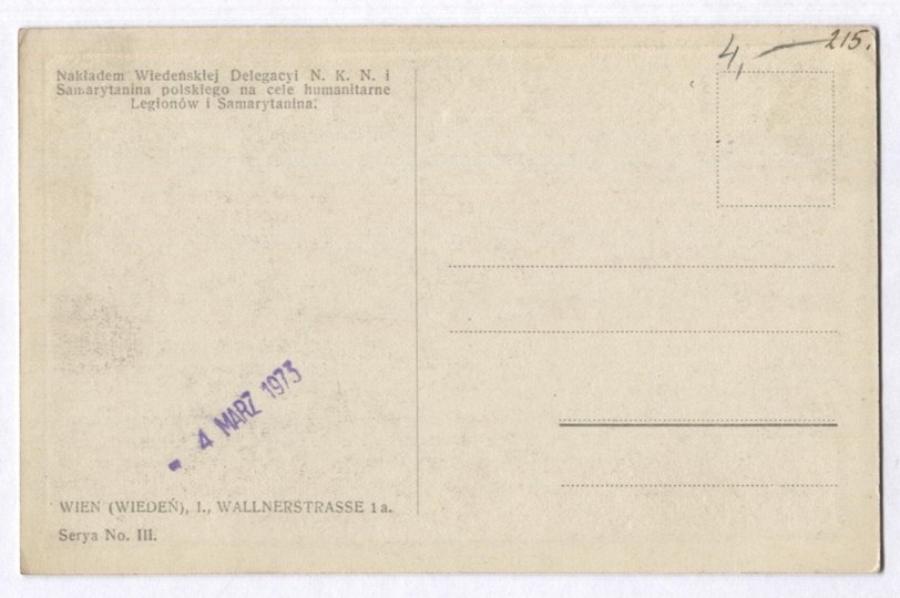 Nakładem Wiedeńskiej Delegacyi N.K.N. i Samarytanina polskiego na cele humanitarne Legionów i Samarytanina. Wien (Wiedeń), I., Wallnerstrasse 1 a. 1915? Na odwrocie nadruk: Serya No. III. Bez korespondencji. Stan dobry.