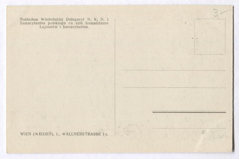 Nakładem Wiedeńskiej Delegacyi N.K.N. i Samarytanina polskiego na cele humanitarne Legionów i Samarytanina. Wien (Wiedeń), I., Wallnerstrasse 1 a. 1915? Bez korespondencji. Stan dobry.