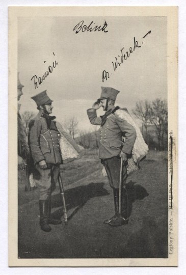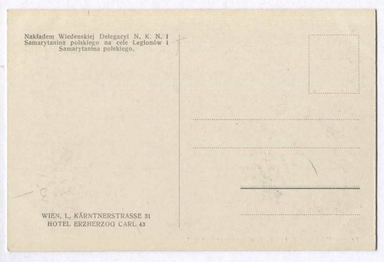 Nakładem Wiedeńskiej Delegacyi N.K.N. i Samarytanina polskiego na cele Legionów i Samarytanina polskiego. Wien, I., Kärntnerstrasse 32, Hotel Erzherzog Carl 43. 1915 (?). Podpis pod pocztówką przekreślony, na fotografii dopisano odręcznie nazwiska widocznych żołnierzy: Kamień, Witczek. Bez korespondencji. Stan dobry.