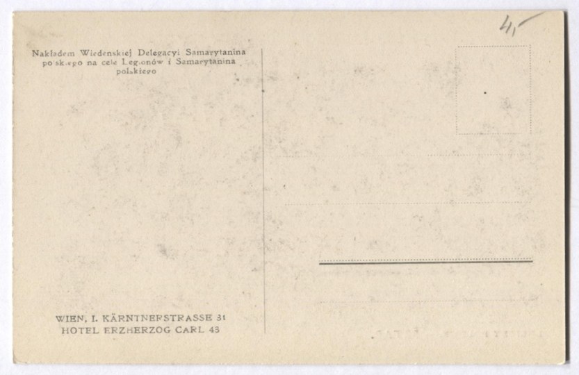 Nakładem Wiedeńskiej Delegacyi Samarytanina polskiego na cele Legionów i Samarytanina polskiego. Wien, I. Kärntnerstrasse 31, Hotel Erzherzog Carl 43. 1915? Bez korespondencji. Stan dobry.