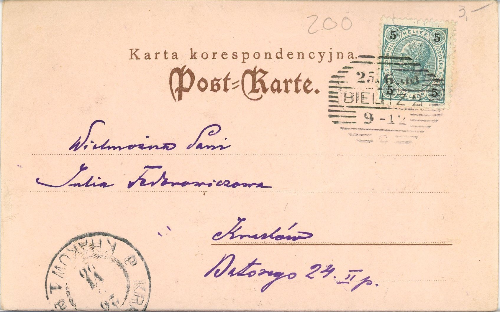Nakładem Edw. Feitzingera w Cieszynie. Kartka zapisana, dat. 25.6.1900 r. Stan dobry.